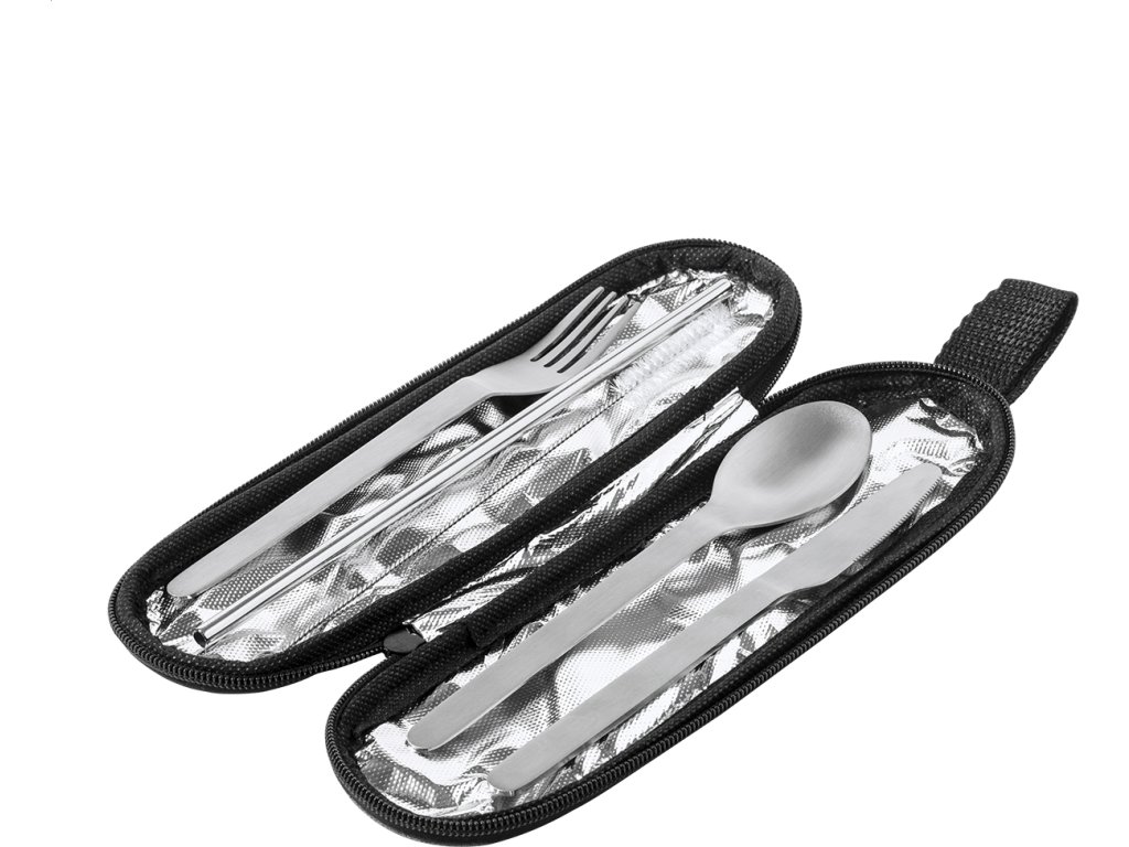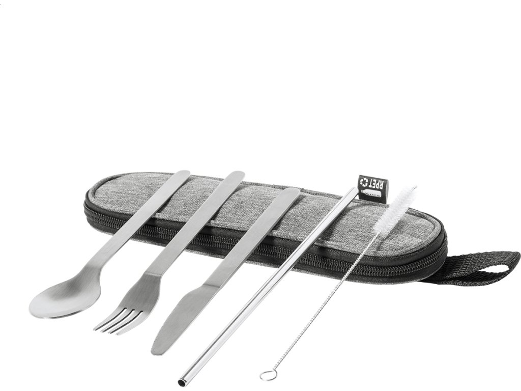 5dílná sada příborů z nerezové oceli v polyesterovém pouzdře RPET. Včetně vidličky, nože, lžíce, brčka a čisticího kartáčku.