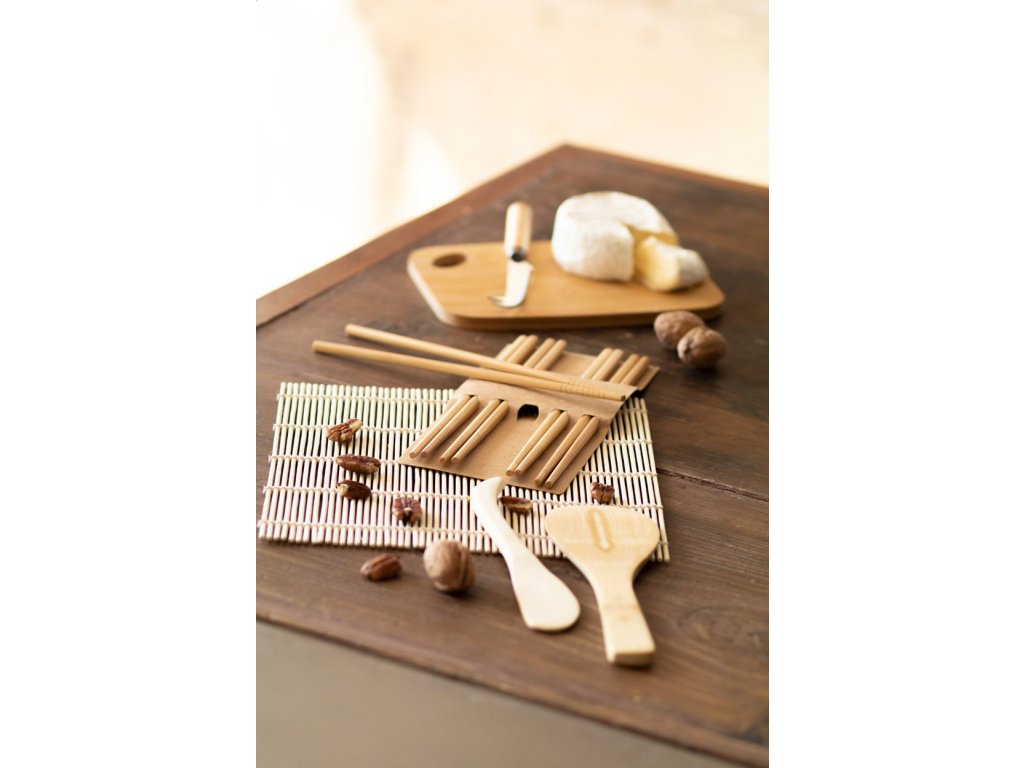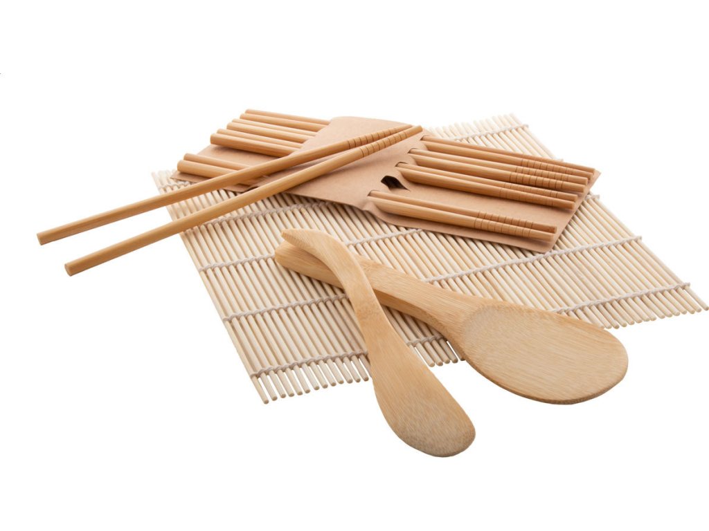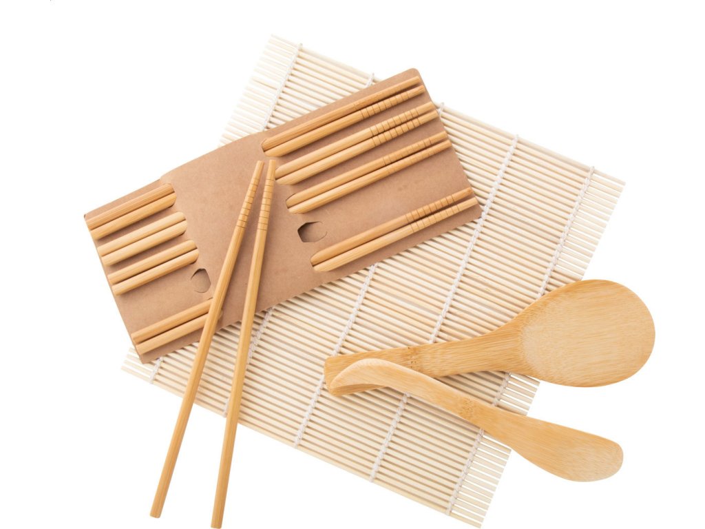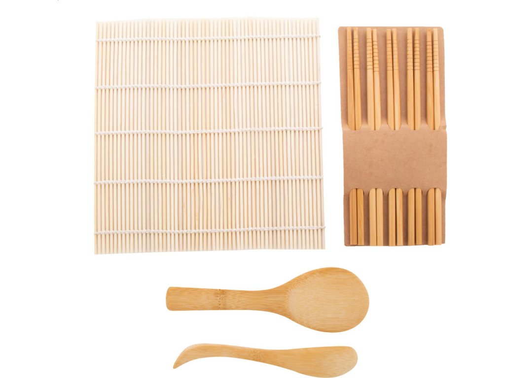 Bambusová sada na přípravu sushi s bambusovou podložkou na sushi, bambusovým nožem a lžící na rýži a 5 páry hůlek. V kraftové papírové krabici.