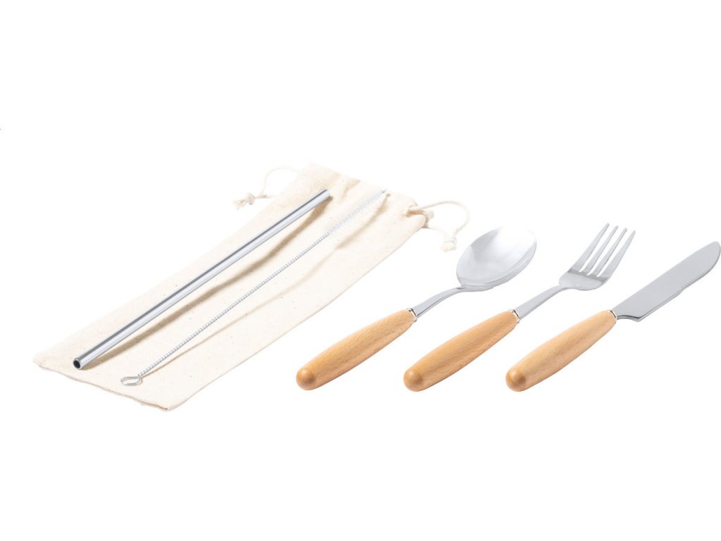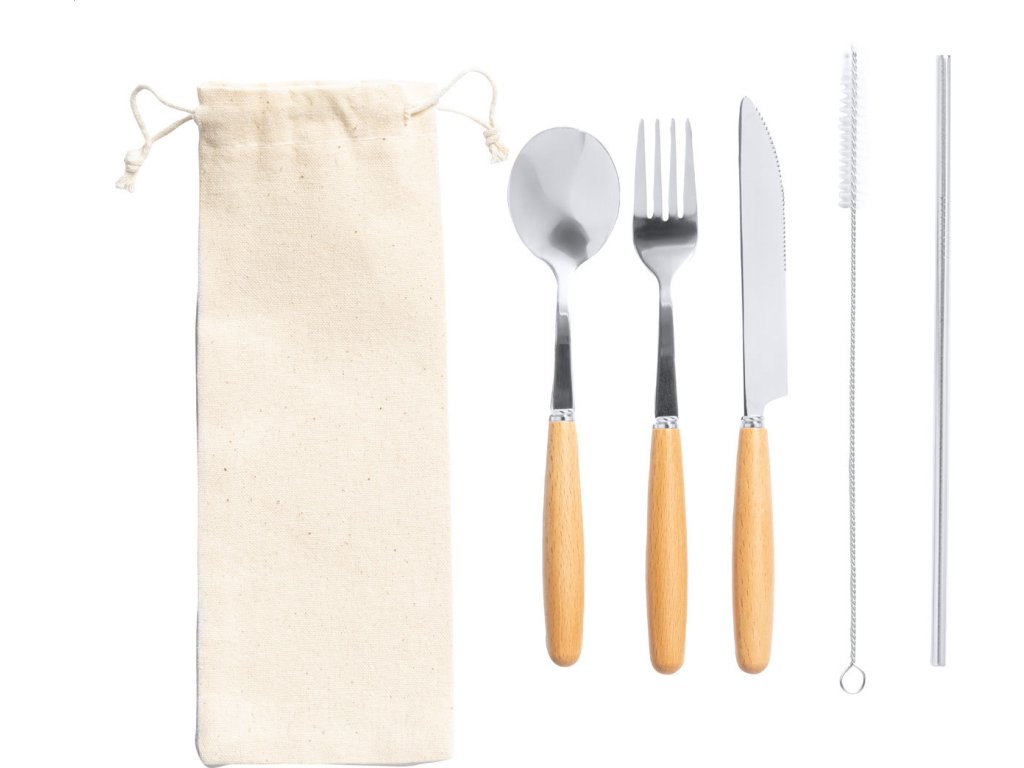 5dílná sada příborů z nerezové oceli s dřevěnou rukojetí, v bavlněném pytlíku se stahovací šňůrkou. Včetně vidličky, nože, lžíce, brčka a kartáčku na čištění.