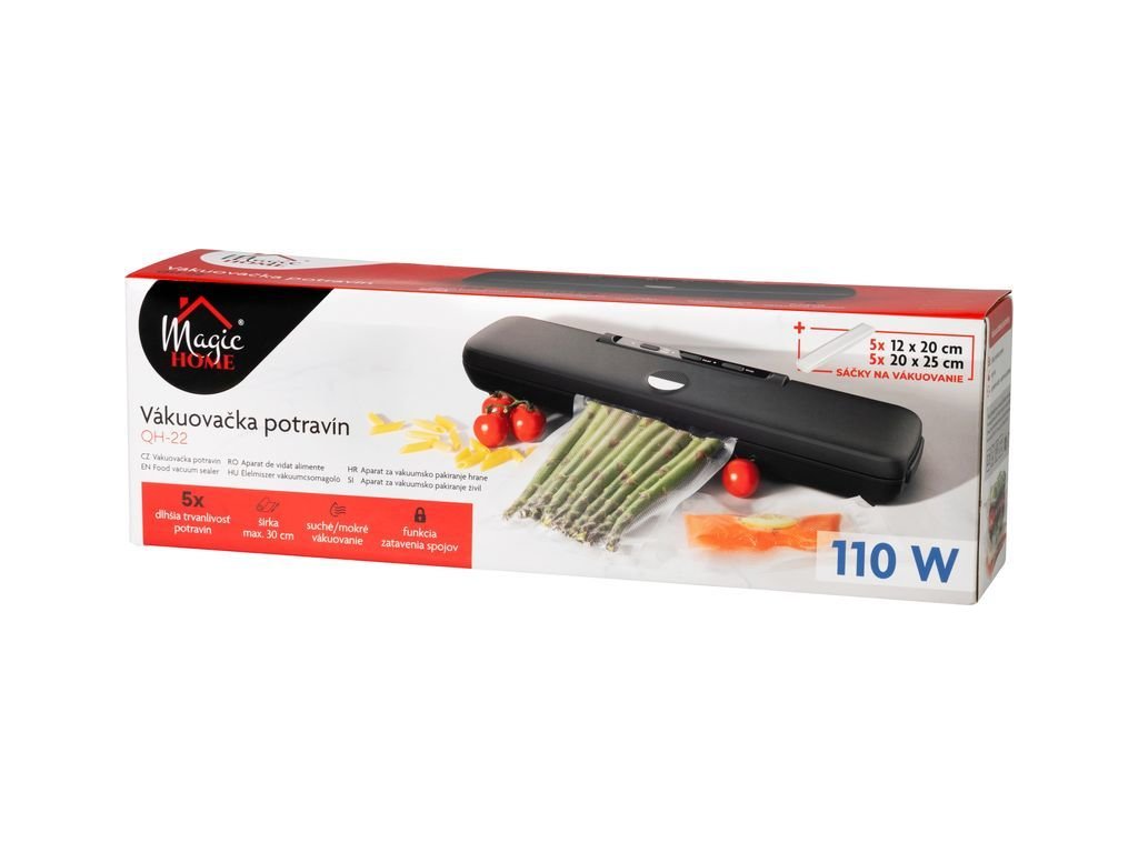 Zachovejte čerstvost svých potravin s praktickou a výkonnou vakuovačkou MagicHome . Tato moderní balicí jednotka je ideální pro domácnosti, které chtějí prodloužit trvanlivost jídla, zabránit vzniku bakterií a minimalizovat plýtvání. Vhodná je pro suché i mokré potraviny .