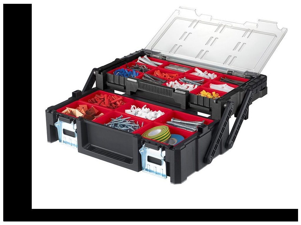 Konzolový systém udržuje všechny dílky v perfektním pořádku. Zároveň však nezvětšuje rozměry organizéru, který zůstává kompaktní a přehledný.