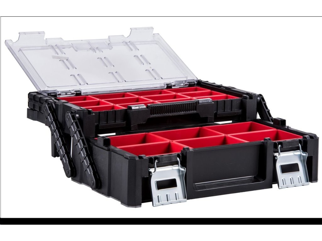 5,8litrový objem, váha 4,4 kg a kompaktní rozměry. Konzolový design a průhledné víko vám maximálně zpřístupní obsah boxu. 18 vyjímatelných přihrádek ve dvou velikostech, opěrné nohy, kovové madlo a přezky.