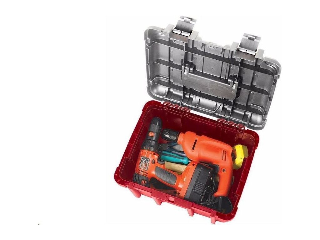 Bezpečný uzavírací systém jistí robustní kovové západky, které chrání obsah před vysypáním během přepravy. Široká rukojeť s vroubkovanou částí pro dlaň zpříjemní nošení nářadí na místo potřeby.