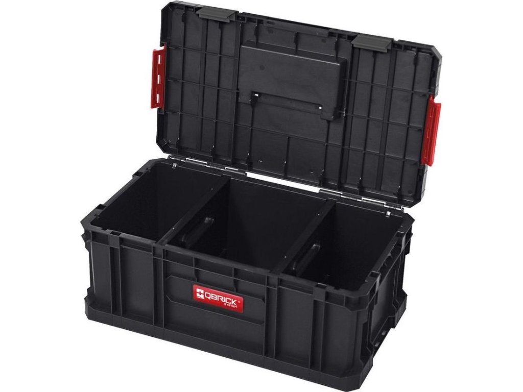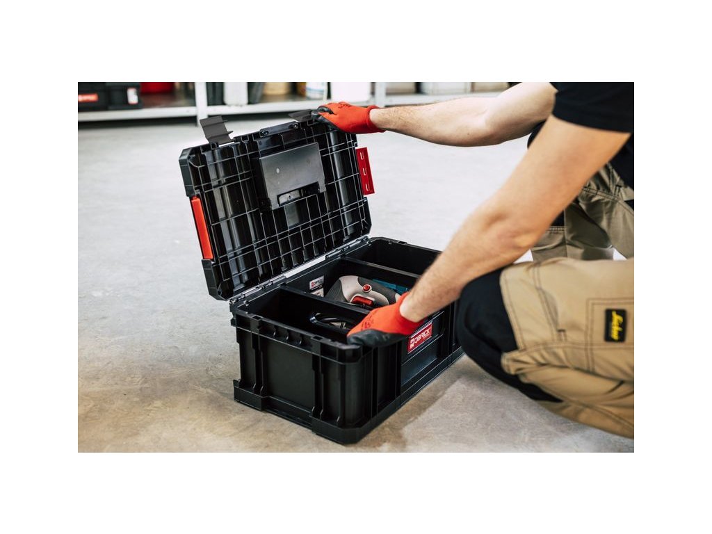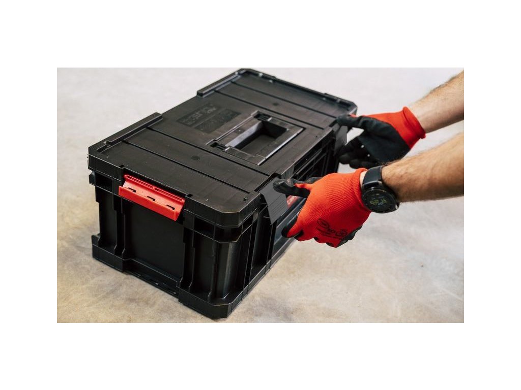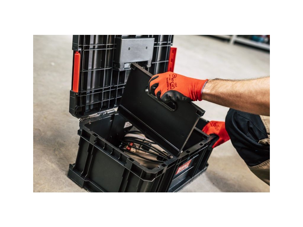 Modulární, odolná skříňka na nářadí s polyamidovými západkami a pevnou rukojetí. Velká kapacita a dva nastavitelné přepážky poskytují pohodlné uložení různých nástrojů.