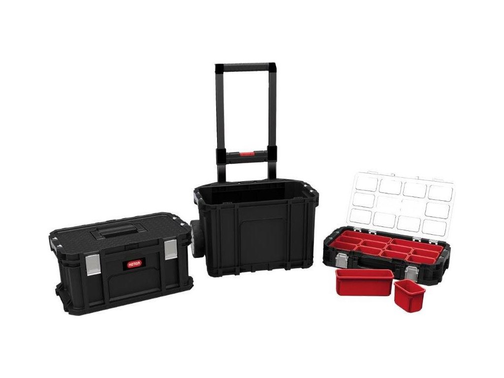 Box na nářadí – vozík, organizér s průhledným víkem a vyjímatelnými přihrádkami a úložný box s odnímatelným tácem, kolečka a madlo pro snadnou manipulaci, pevné uzavření.
