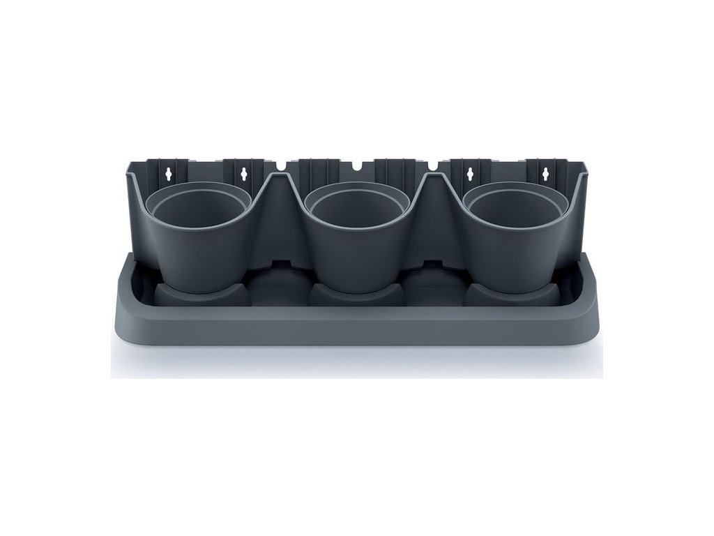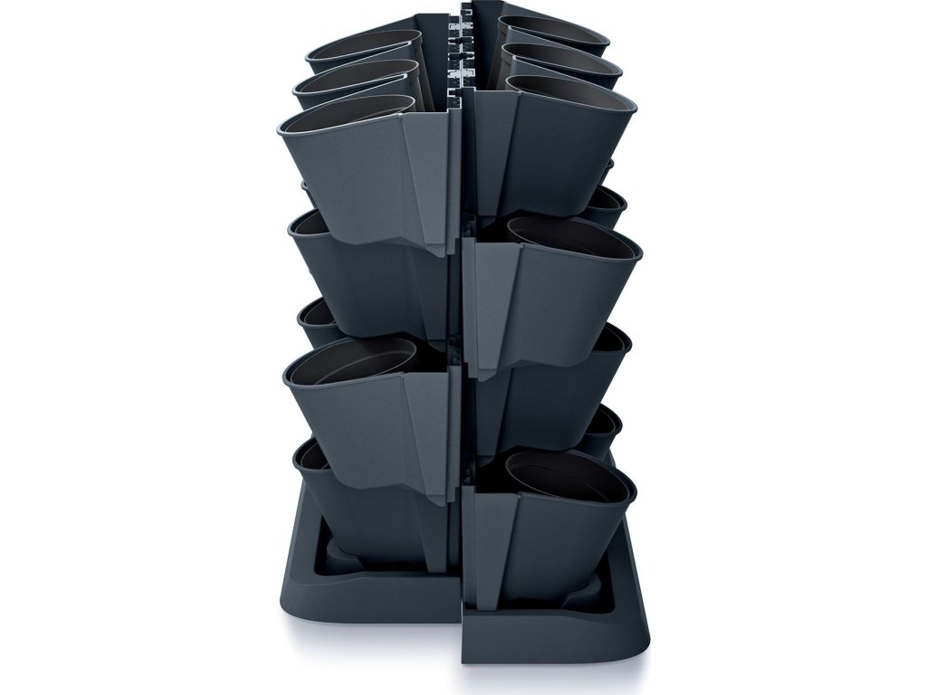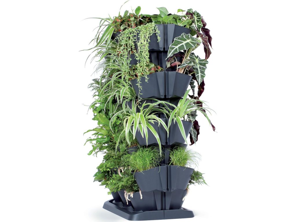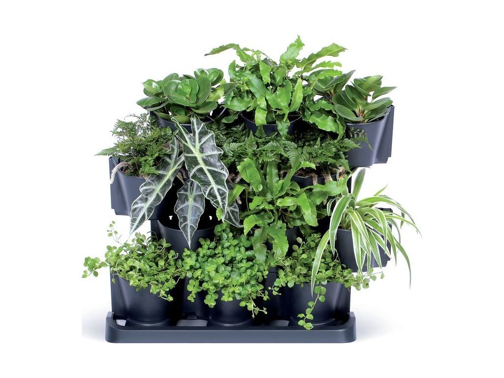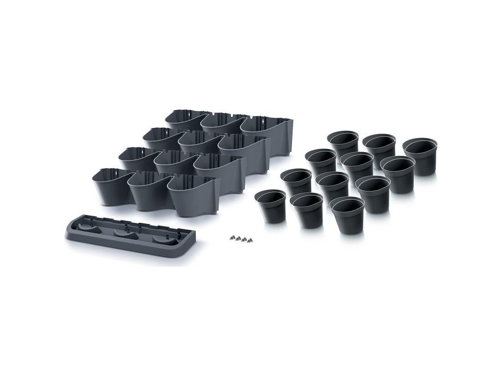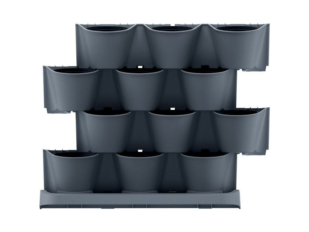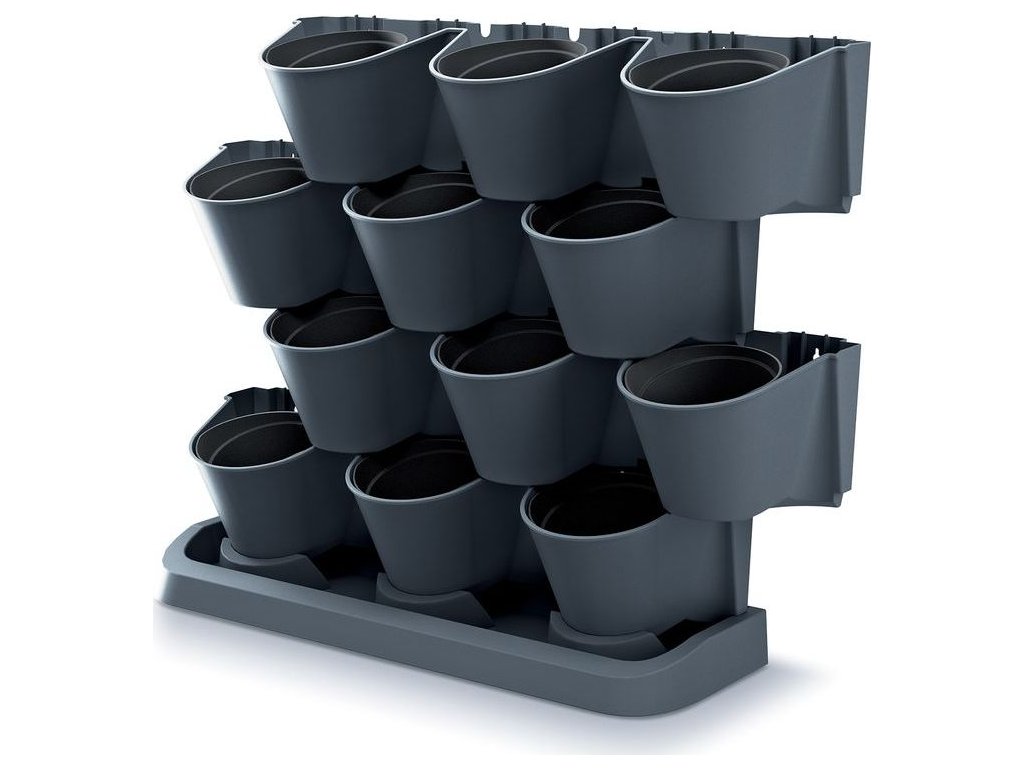 Sada vertikálních květináčů, vhodné pro venkovní i vnitřní použití, celkem 12 květináčů, možnost využití zavlažovacího systému (ten není součástí balení), plast, 3,632 kg, rozměry (d x š x v): 68,5 x 19 x 54,6 cm, barva antracit.