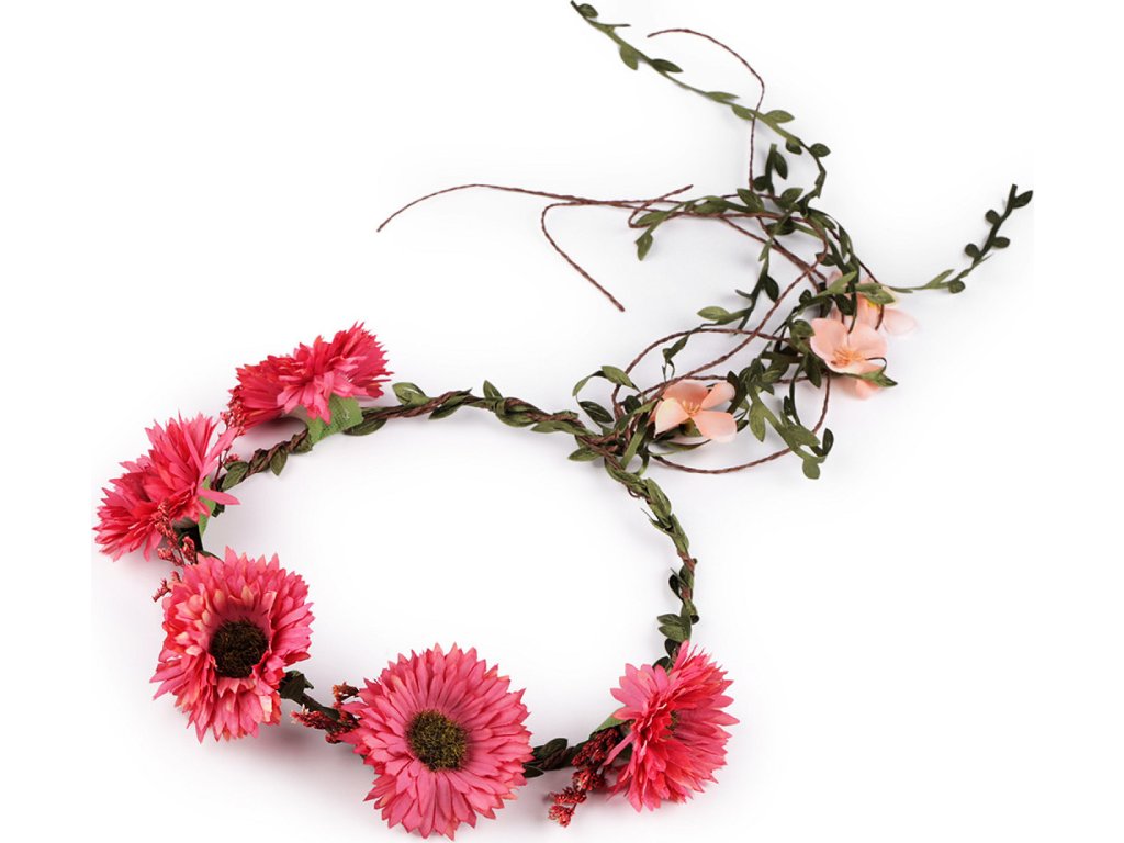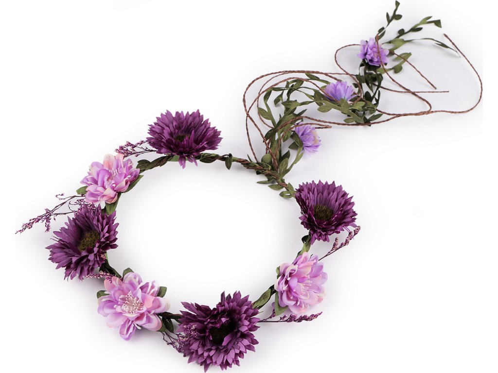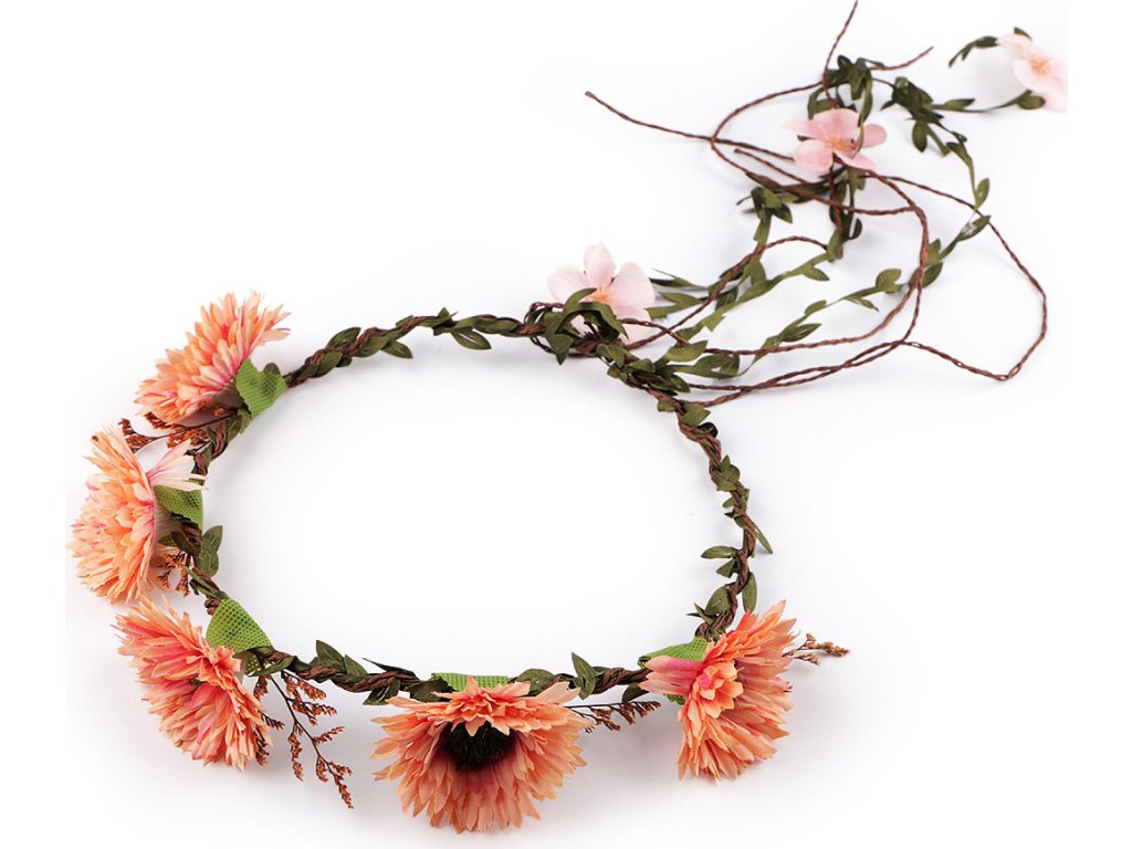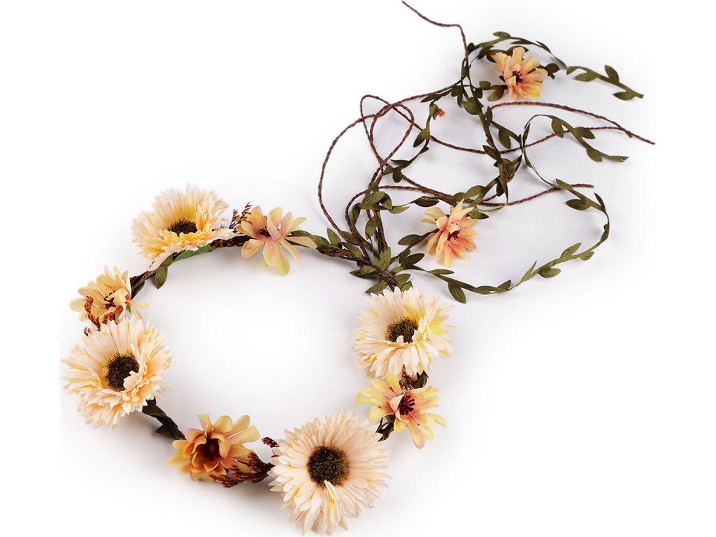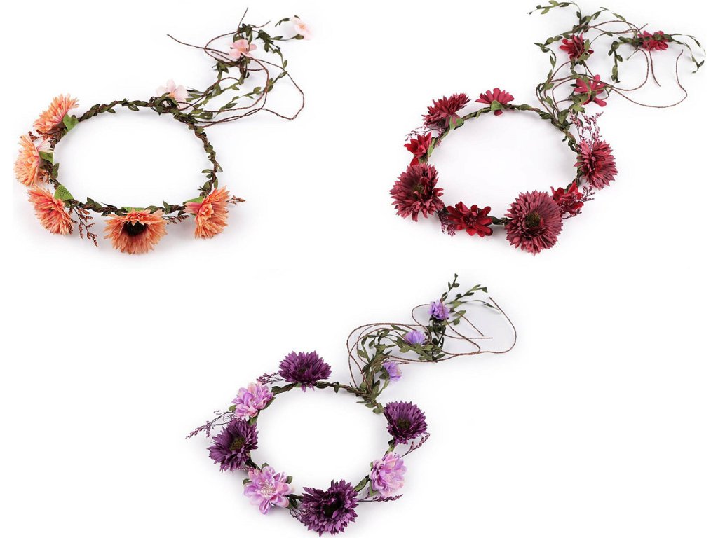 Bohémský věneček s květy vás promění v křehkou vílu z pohádky. Můžete jej nosit jako ozdobu vlasů nebo použít k dekoračním účelům. Květy vypadají jako živé. Jsou připevněné k drátěné kostře, která je obalená papírem a ovinutá prýmkem s lístečky. Díky drátěnému základu můžete věneček tvarovat, velice příjemně se nosí. Věnečky mohou mít různou barvu pestíků. Není vhodné pro děti do 3 let.