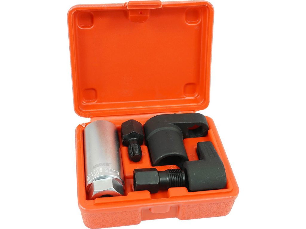 Klíče na montáž a demontáž lambda sond a čidel, se závitníky na pročištění a opravu jejich závitů. Umožňuje kompletní servis – kromě vyjmutí a opětovné montáže součástí také regeneraci jejich závitů. Určeno pro vozidla značek: Audi, BMW, Mercedes, Peugeot, Renault, Škoda, Vauxhall, Opel, koncern GM, Volkswagen a další. Sada 5 kusů obsahuje: Klíč na lambda sondu 1/2“ x 22 mm, délka 50 mm Klíč na lambda sondu 3/8“ x 22 mm, délka 31 mm Klíč na snímače a lambda sondy 3/8“ x 22 mm, výřez 6 mm, délka 80 mm Závitník M12 x 1.25 mm Závitník M18 x 1.5 mm Vyrobeno z chrom-vanadové (Cr-V) oceli. Dodáváno v plastové krabičce.