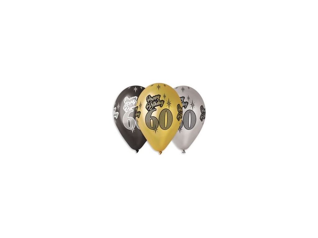 Latexové balónky s potiskem Happy Birthday k oslavě 60tých narozenin ( stříbrná, zlatá, černá )