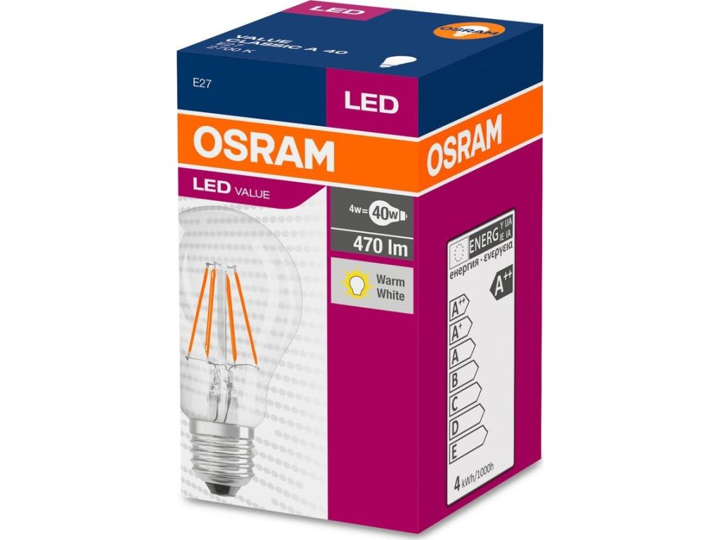 OSRAM LED Filament VALUE ClasA 230V 4W 827 E27 noDIM A++ Sklo čiré 470lm 2700K 10000h (krabička 1ks)