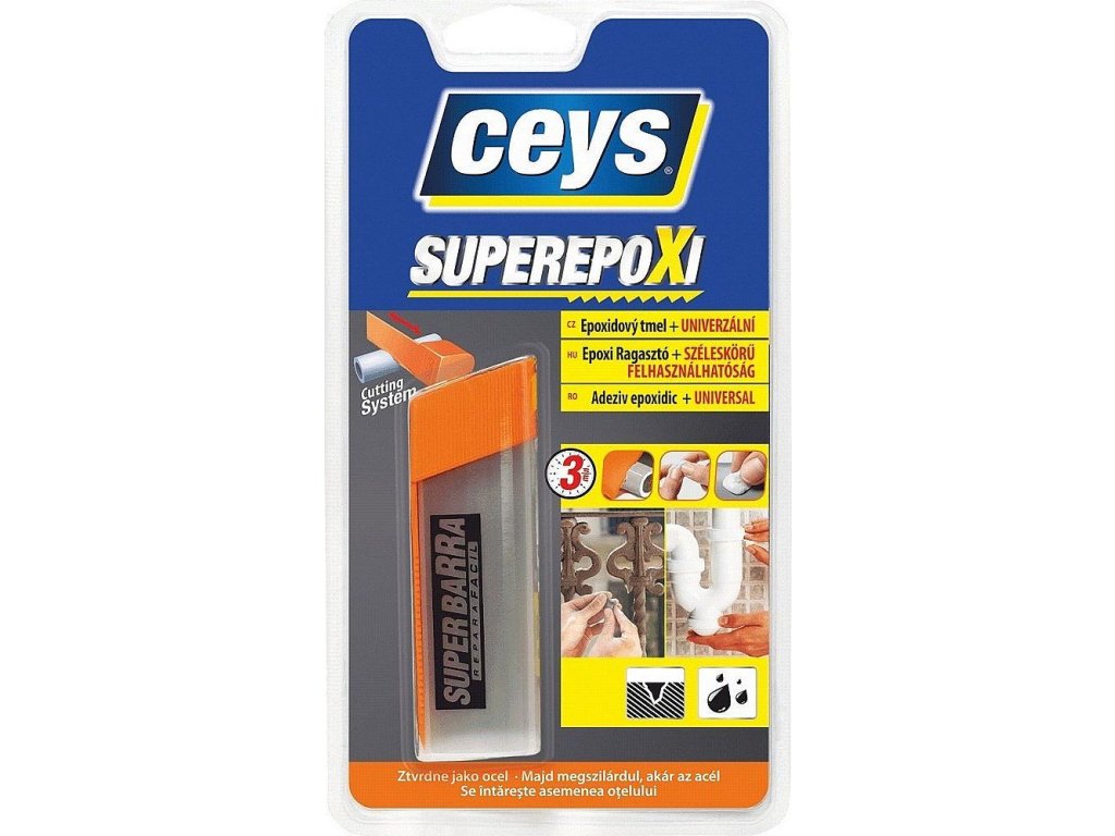 SUPER EPOXI UNIVERZÁL je velmi odolný dvousložkový tmel, lehce tvarovatelný, určený pro přichycení, přilepení, vyplnění, restaurování a opravy v domácnosti.