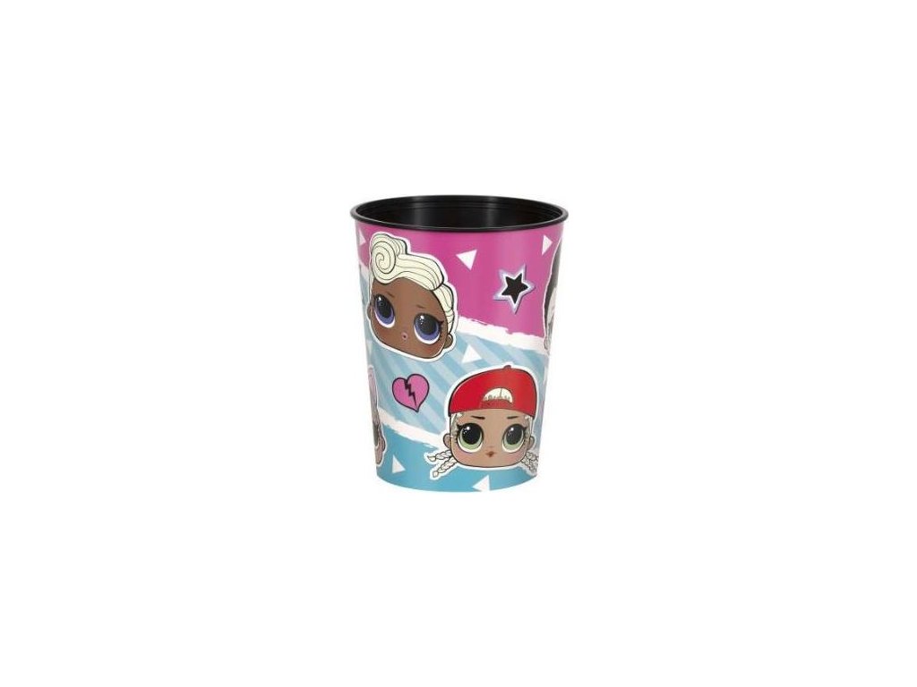 Plastový kelímek s obrázky panenek Lol Surprise.