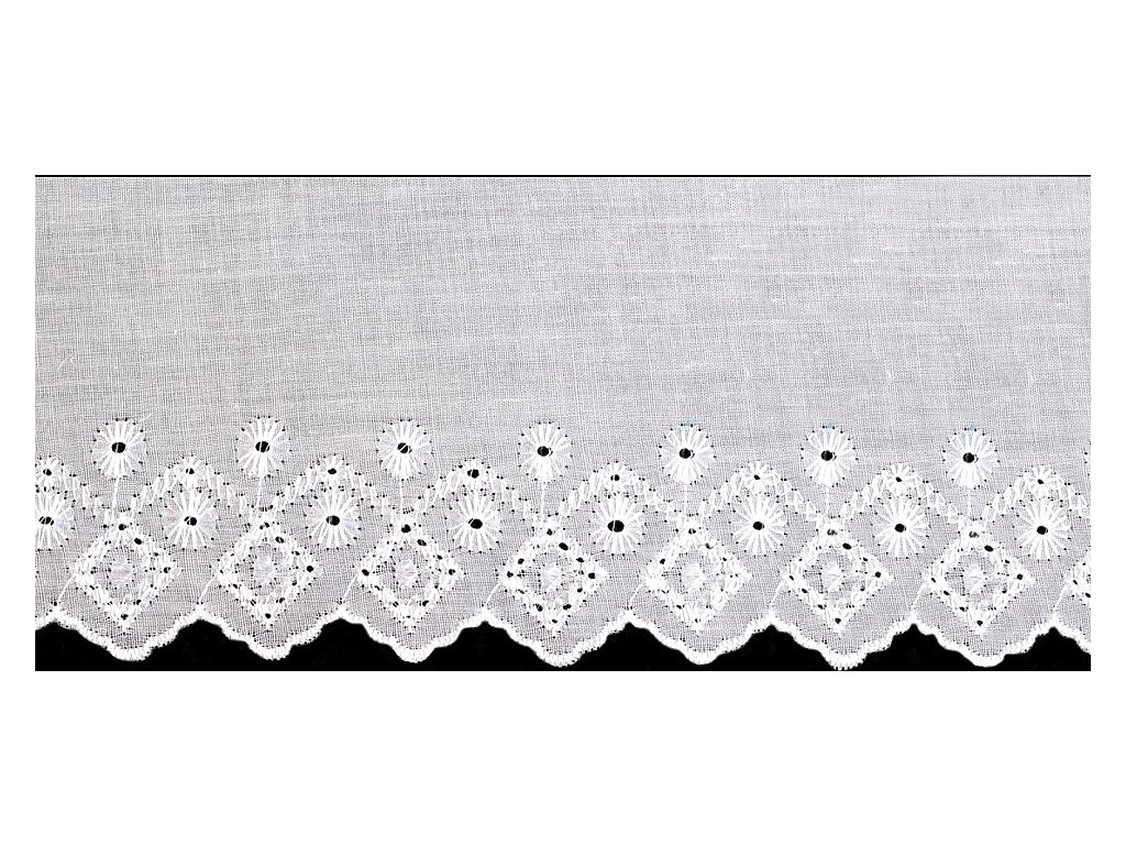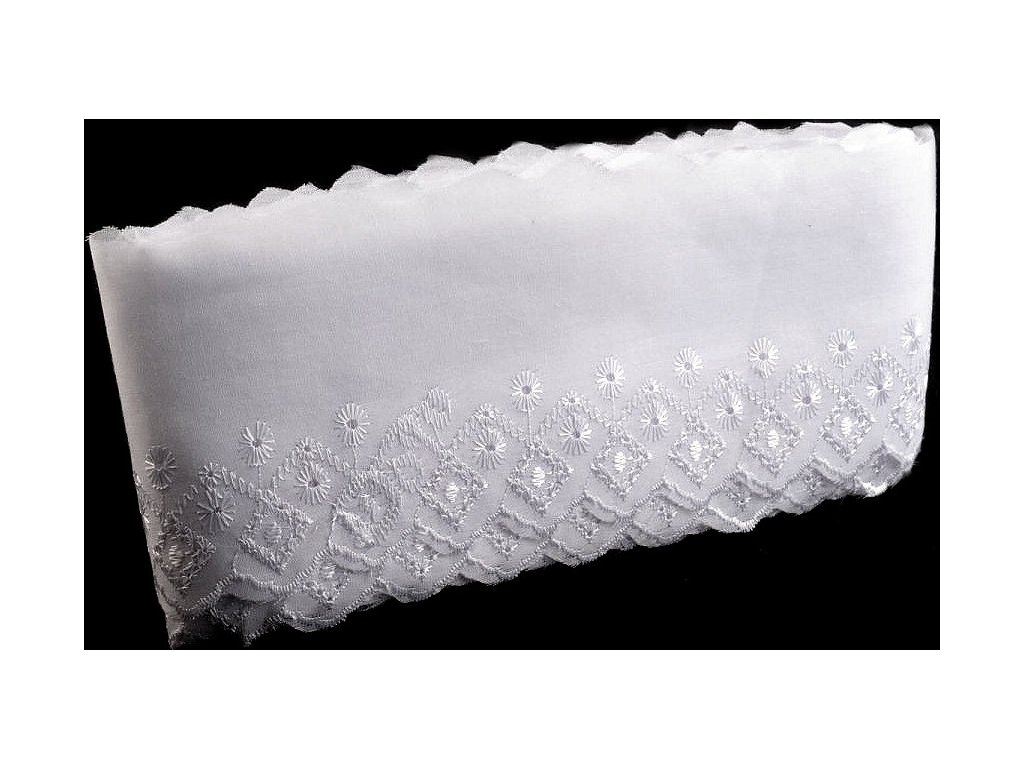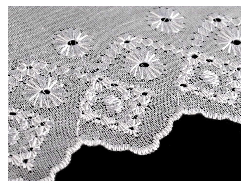 Madeiru zdobí designový motiv s lesklou dírkovou výšivkou. Je vhodná na zdobení oděvů i bytového textilu, například polštářů, povlečení, ubrusů, záclonek apod. Často se používá i jako ozdoba dětských zavinovaček.