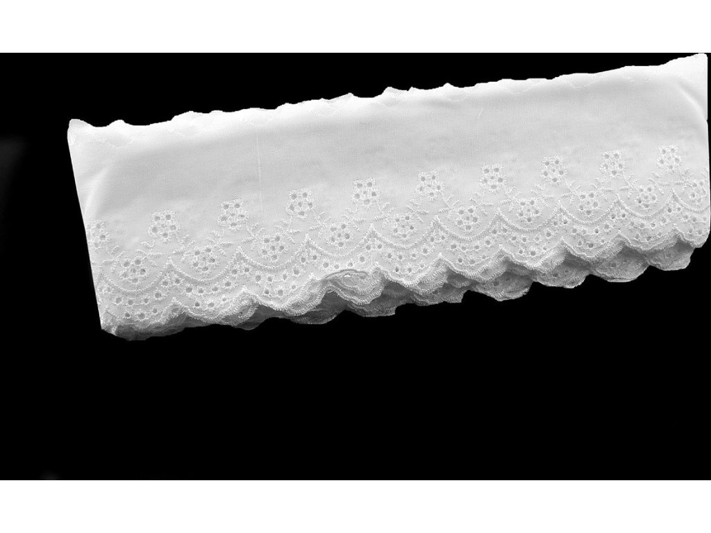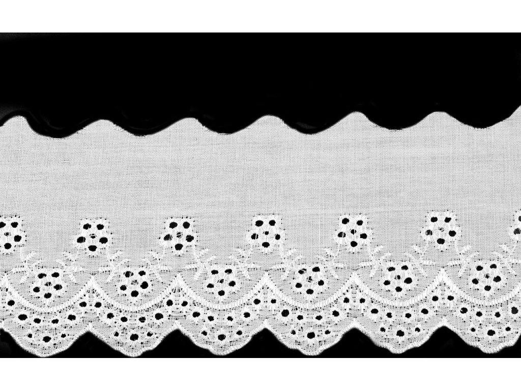 Madeira s typickou dírkovanou výšivkou je vhodná k ozdobení oblečení (šatů, tunik, sukní, halenek apod.), ale také bytového textilu, například polštářů, povlečení, deček, kuchyňských záclonek, ubrusů atd. Šíře nevyšité části se může mírně lišit (±10%).