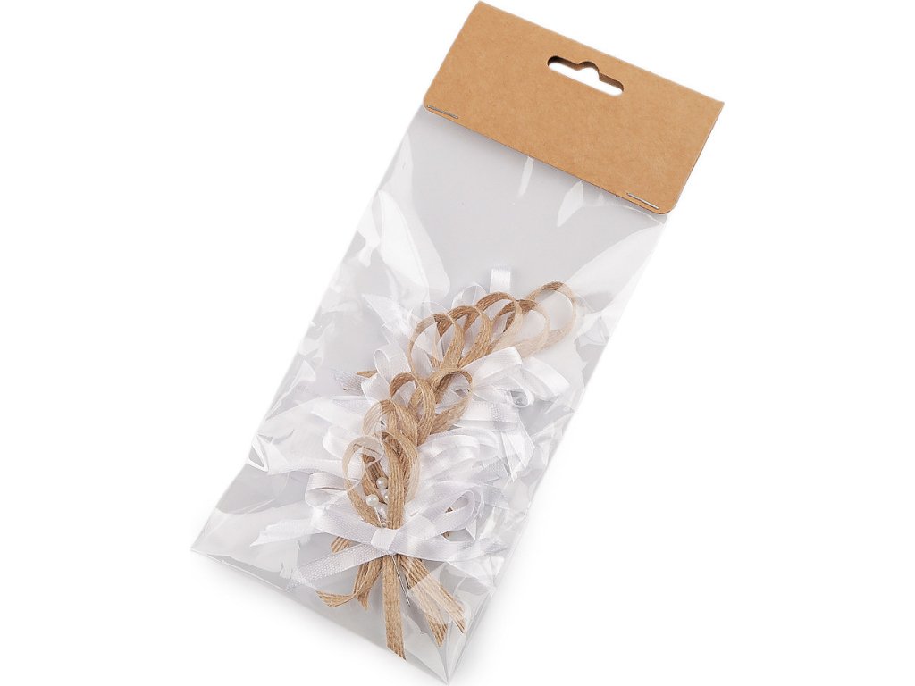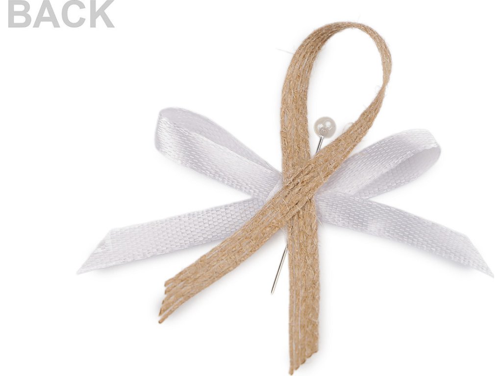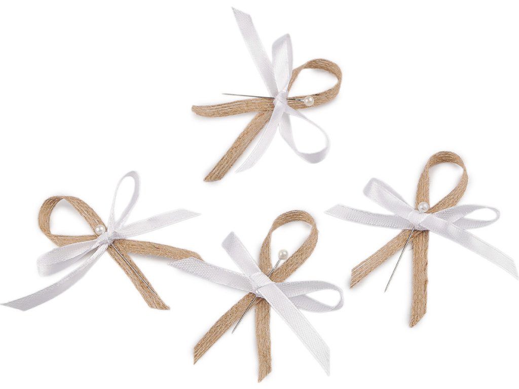 Svatební jutové mašličky v boho stylu jsou velice populární. Slouží především k ozdobení klopy ženicha a svatebčanů. Jsou kvalitní, ručně zpracované. Skládají se z jutové stuhy, saténové mašle a perleťového špendlíku. Mašličky můžete použít také k aranžování různých svatebních dekorací. Mašličky jsou zabalené po 10 ks v sáčku s papírovou kartou na zavěšení na prodejní stojan.
