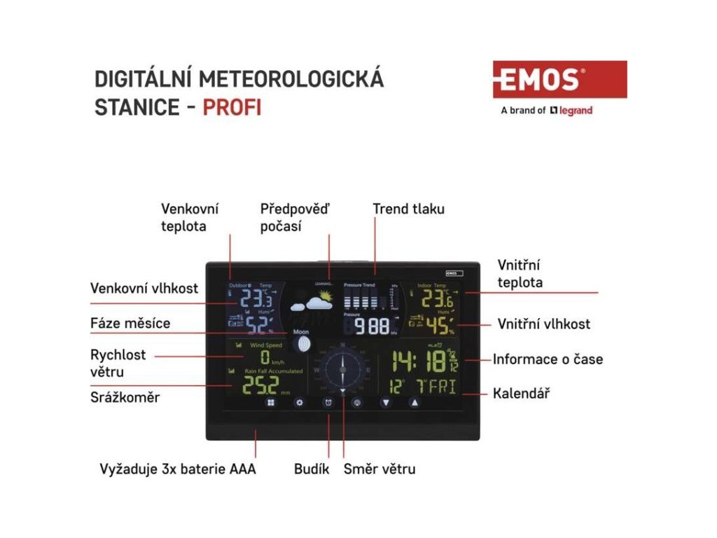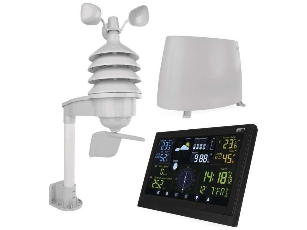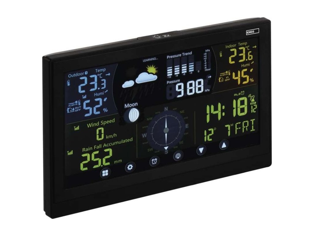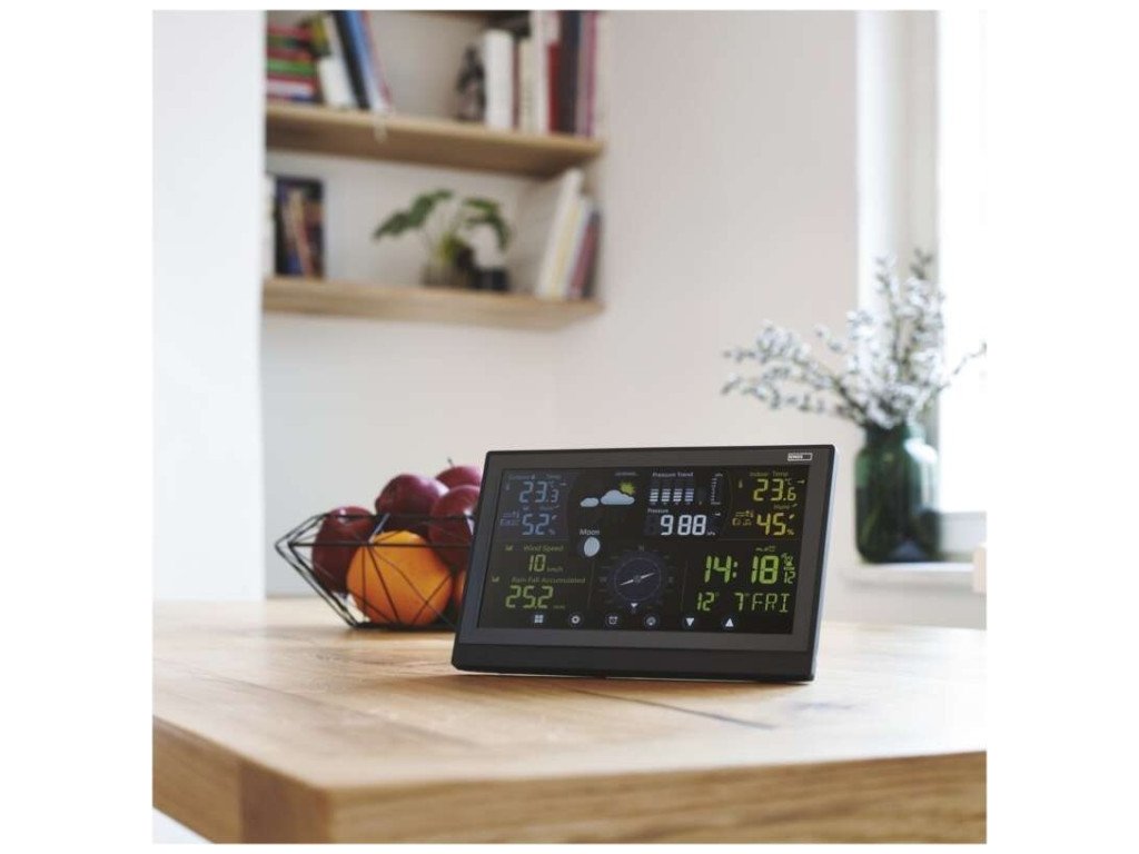 Přesné hodiny jsou řízené DCF signálem a praktický je také budík s opakovaným buzením a kalendář. LED podsvícený displej se může pochlubit intuitivním dotykovým ovládáním a vysokým pozorovacím úhlem. Profesionální meteostanice se postará o zobrazení venkovní i vnitřní teploty, tlaku, vlhkosti, rychlost větru a také fáze měsíce. Meteostanice dokáže zobrazit profesionální hodnoty, předpoví počasí a ukáže trend vývoje teplot a vlhkosti. Ukládá také teplotní minima a maxima.