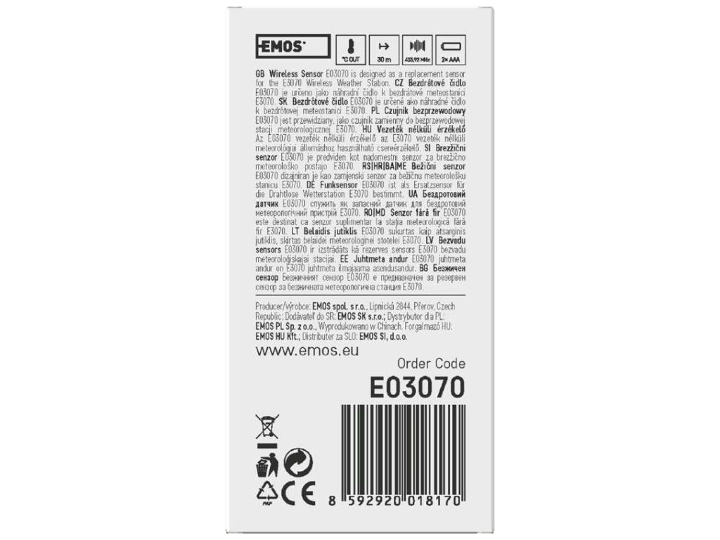 určeno pro typ hlavní jednotky E3070 napájení 2× 1,5 V AAA (nejsou součástí balení) ukazatel venkovní vlhkosti ne dosah ve volném prostoru až 30 m externí drátová teplotní sonda ne frekvence 433 MHz provozní teplota -30 °C až...