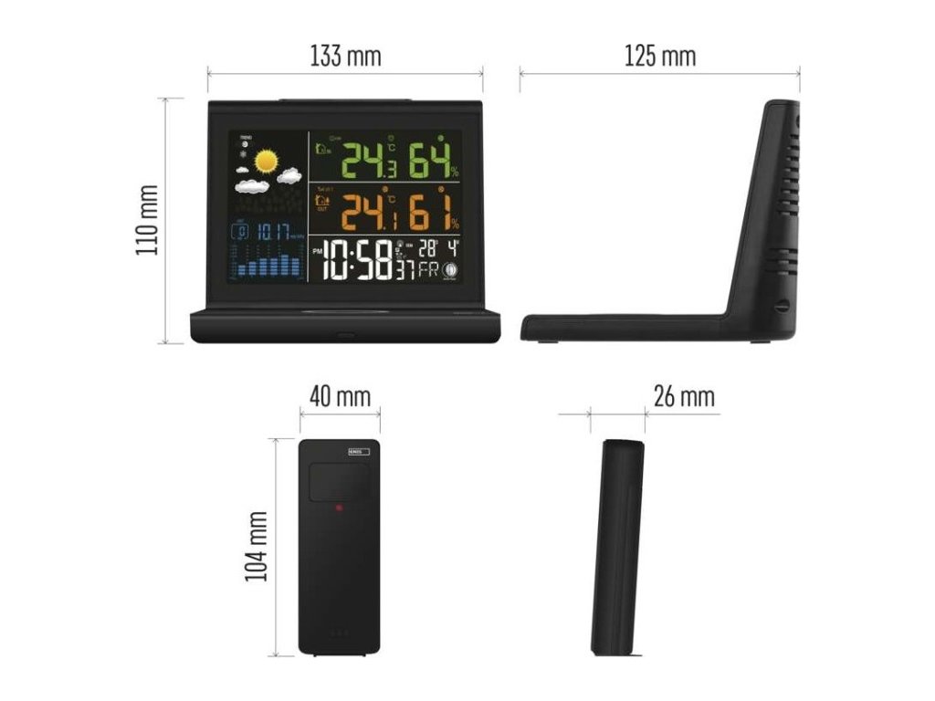 •Veškeré údaje o teplotě a počasí jednoduše zjistíte pohledem na přehledný podsvícený VA displej, který má široký pozorovací úhel•Podsvícení lze nastavit přesně dle vašich preferencí, a to na maximální, střední úroveň nebo jej lze úplně vypnout•Hodiny řízené DCF signálem pro maximální přesnost a komfort (seřizují se samy bez manuálního zásahu)•Možnost připojení až tří senzorů s dosahem až 100 m•Napájení stanice pomocí síťového adaptéru USB-C s délkou 1,5 m (součástí balení) a 2× AA (nejsou součástí balení)•Senzor je napájen 2× AAA (nejsou součástí balení)Díky této meteostanici budete vždy s jistotou vědět, na jaké počasí se připravit a nic vás nepřekvapí. Aktuální informace vždy k dispozici.