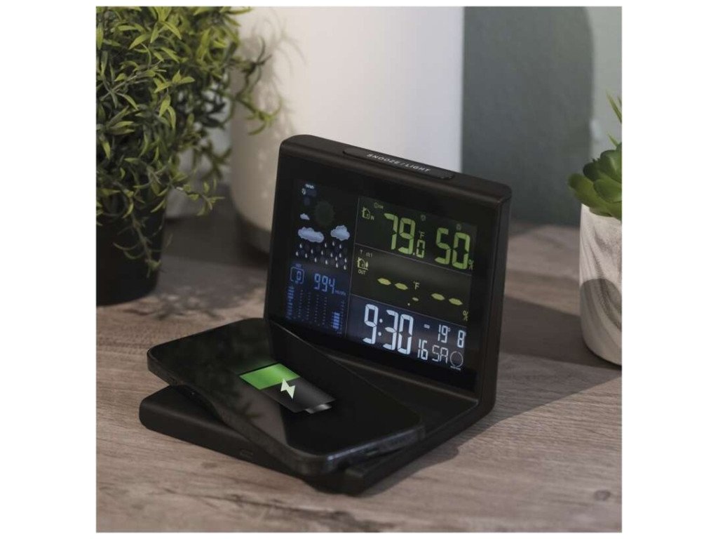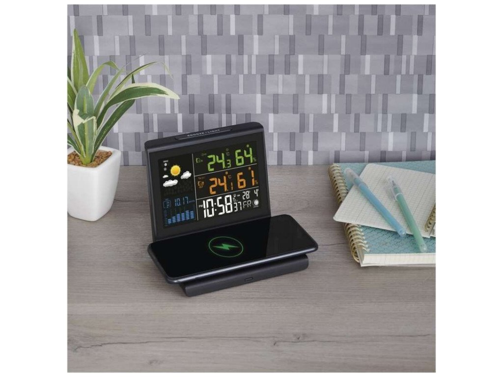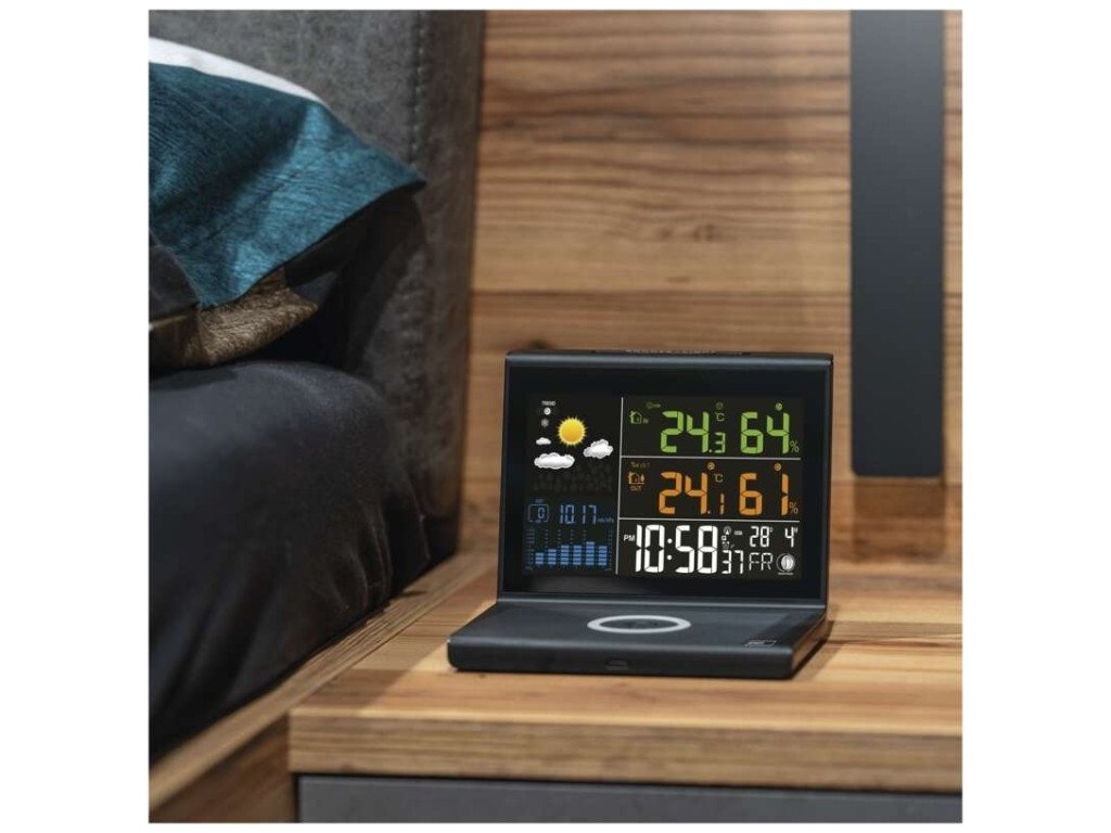 Bezdrátové QI nabíjení 10 W. VA displej - velmi dobrý kontrast a viditelnost ze všech úhlů - 3 úrovně podsvícení. Historie měření tlaku. Hodiny řízené DCF signálem. Možnost připojení 3 čidel.