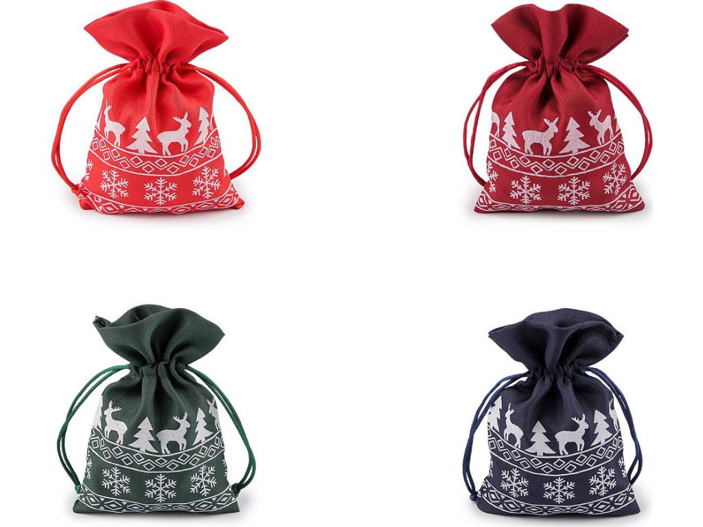 Vánoční dárkový pytlík je z obou stran ozdobený potiskem sobů, stromečků a vloček. Můžete ho použít na dárky nebo ho naplnit mikulášskou nadílkou, ušetří vám čas při balení. Dá se naaranžovat i jako vánoční dekorace. Stahuje se pomocí kulatých saténových šňůrek, dárku dodá osobní kouzlo a půvab.