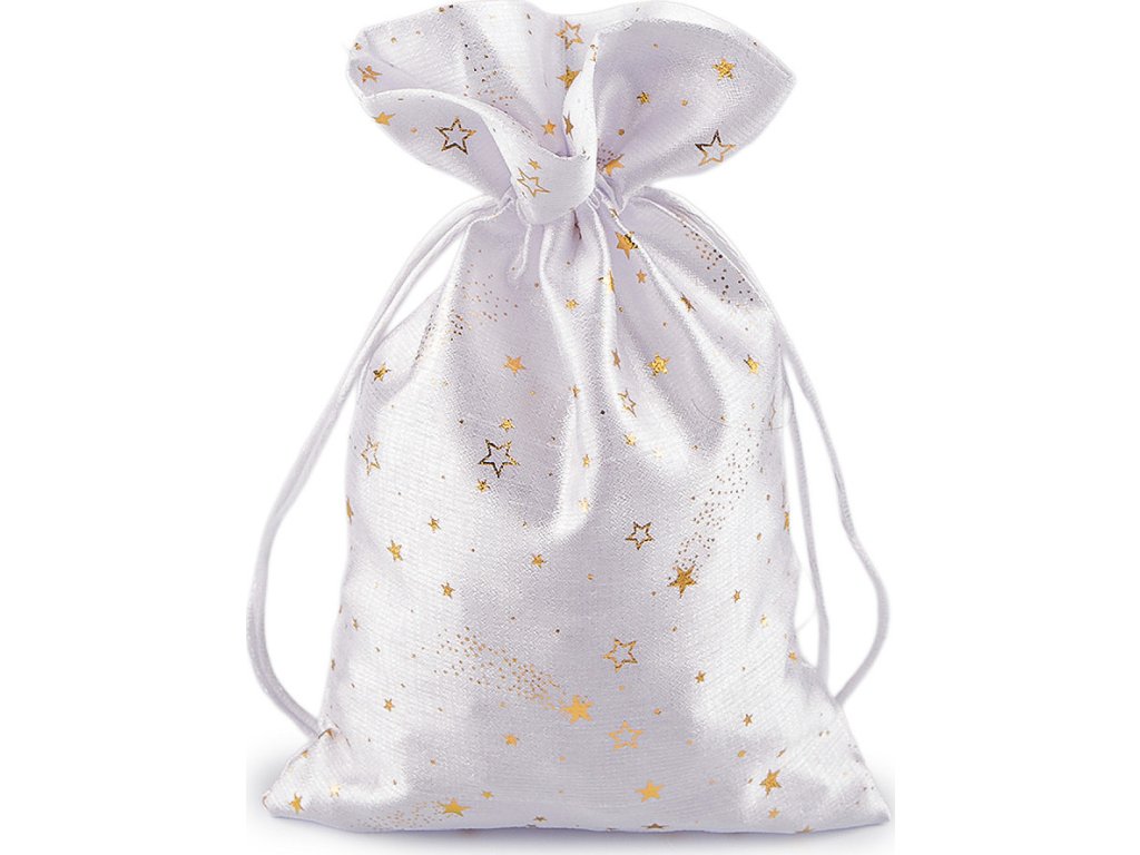 Vánoční dárkový pytlík je středně velký, z obou stran ozdobený potiskem zlatých metalických hvězdiček. Působí elegantně a luxusně, můžete ho použít na dárky nebo ho naplnit mikulášskou nadílkou, ušetří vám čas při balení. Dá se naaranžovat i jako vánoční dekorace. Stahuje se pomocí kulatých saténových šňůrek, dárku dodá osobní kouzlo a půvab.