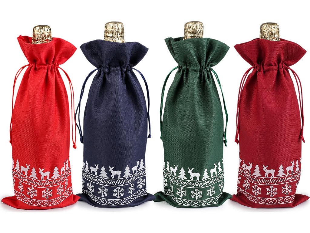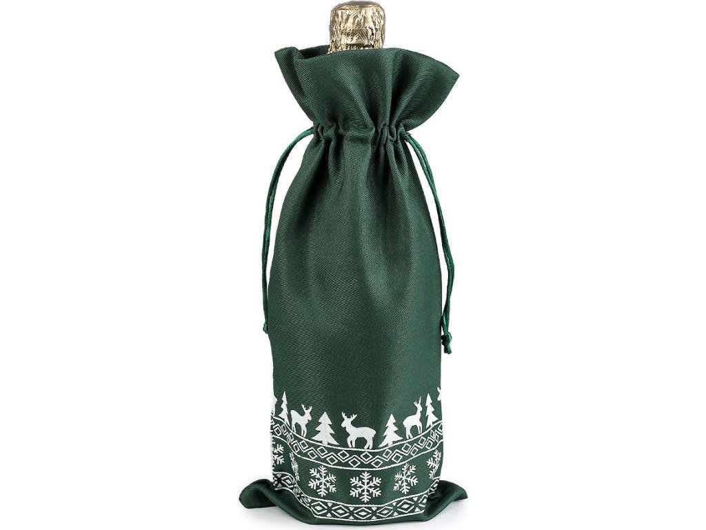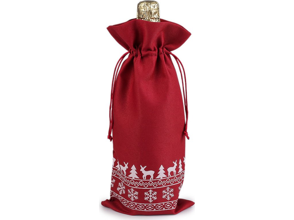 Vánoční dárkový pytlík je z obou stran ozdobený potiskem sobů, stromečků a vloček. Je určený na zabalení lahví a jiných podlouhlých dárků. Pytlík je dostatečně vysoký, ať už se rozhodnete pro dárek s alkoholem nebo s domácí limonádou, ušetří vám čas při balení. Stahuje se pomocí kulatých saténových šňůrek, dárku dodá osobní kouzlo a půvab. Láhev není součástí pytlíku.