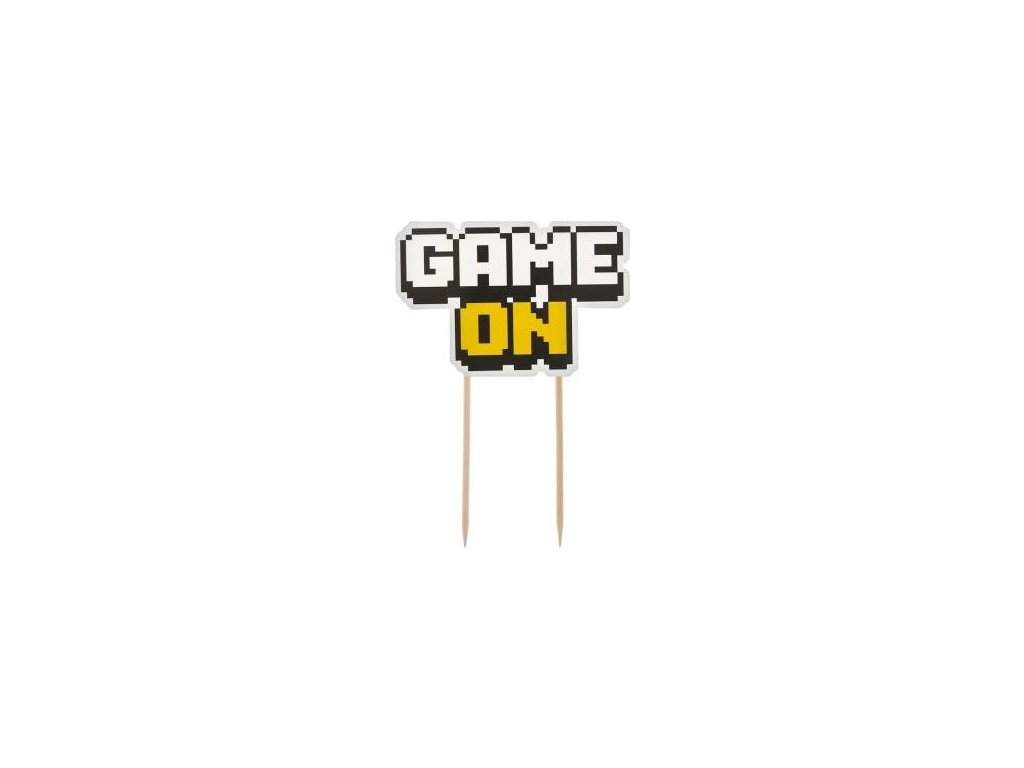 Nápis "Game On " je připevněný na dřevěných špejlích pro snadné umístění na dort.
