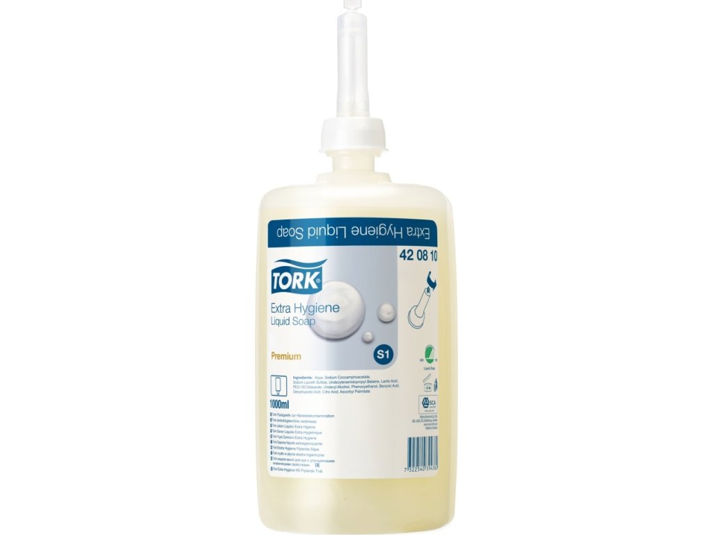 Tekuté mýdlo Tork, vhodné do potravinářství,1 litr-1000 dávek, jednorázová láhev včetně dávkovácí pumpičky.