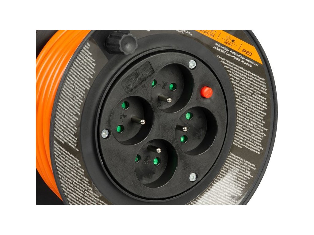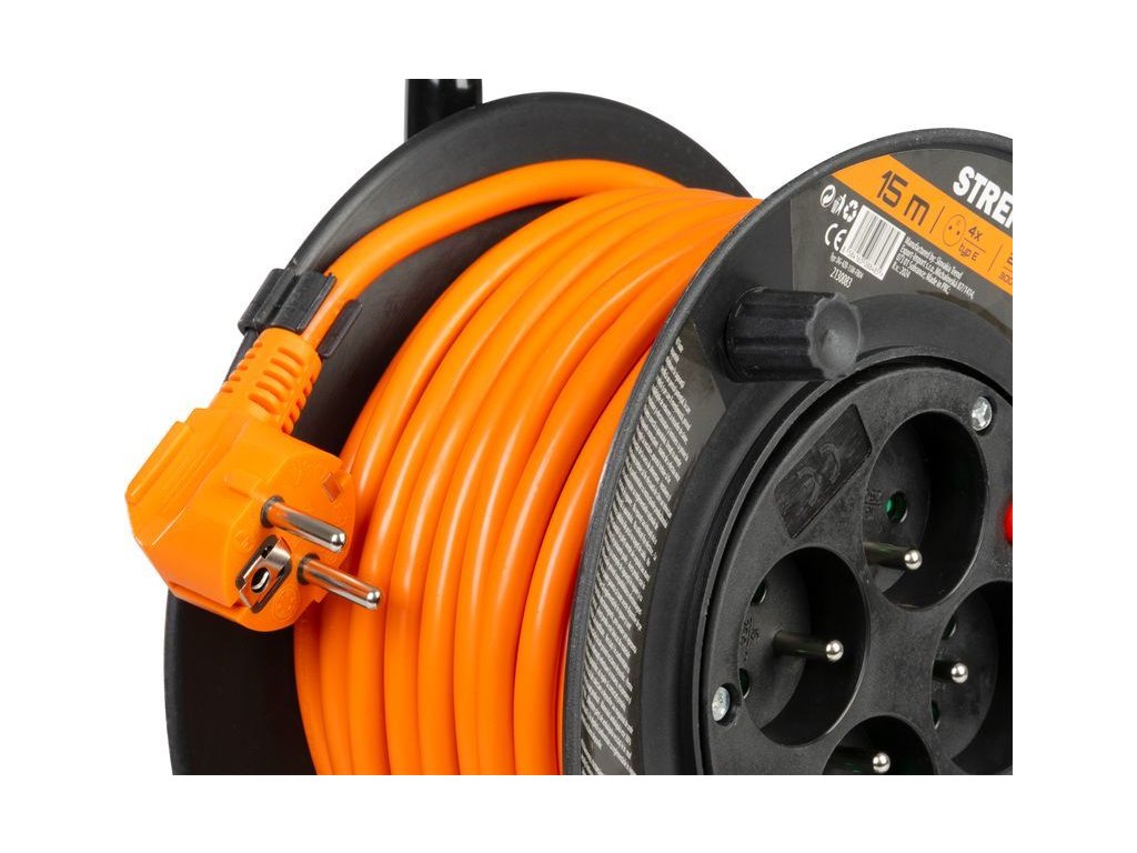 Kvalitní prodlužovací kabel Strend Pro DG-FB04 v oranžovém provedení namotaný na bubnu je dlouhý 15 metrů. Efektivně rozšíří přívod elektřiny do vzdálených míst. Na bubnu má čtyři zásuvky (230 V), takže můžete napájet více zařízení najednou. Skvěle se hodí do domácnosti nebo zahrady. Kabel je vhodný pro maximální zatěž až do 3 000 W/16A, v případě že je zcela rozvinutý. Maximální zátěž při navinutém kabelu je 1200 W/16 A. Kabel má vodiče o průřezu 1,5mm.