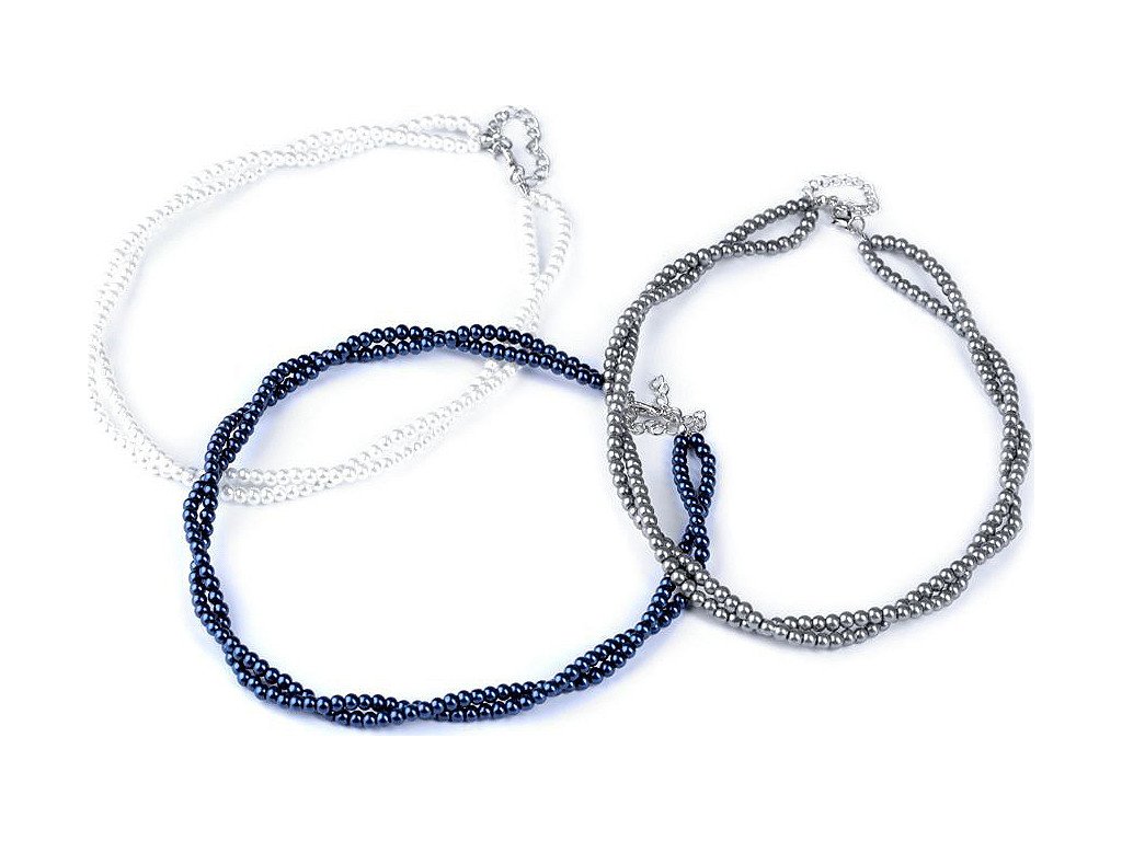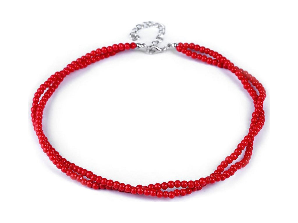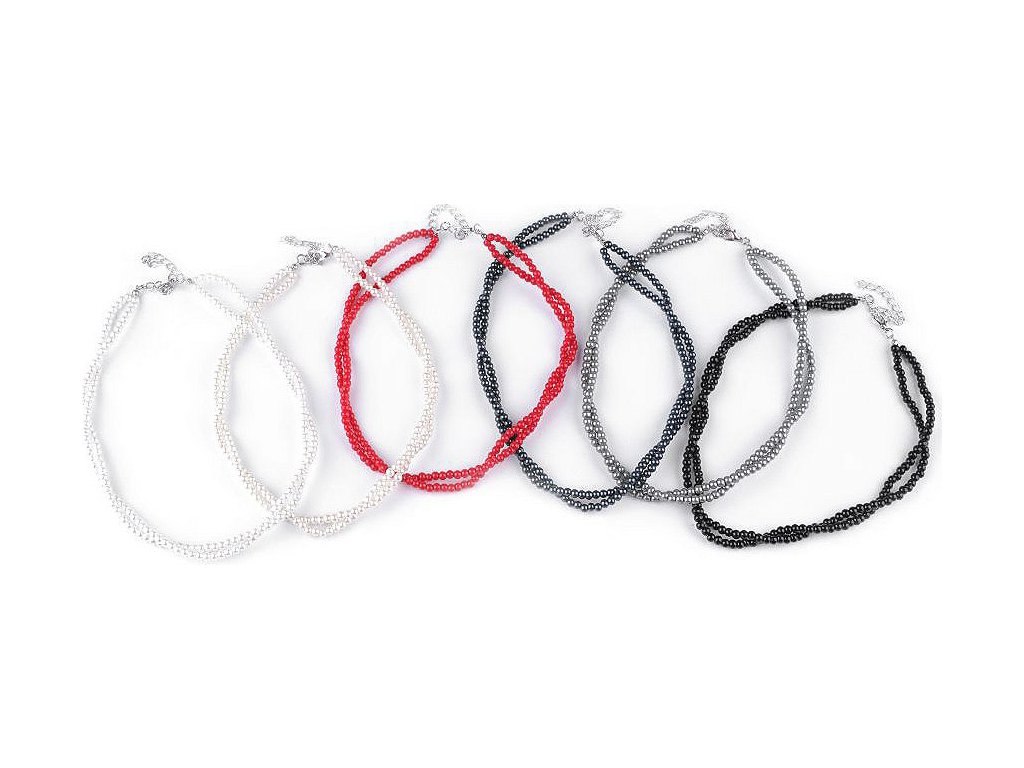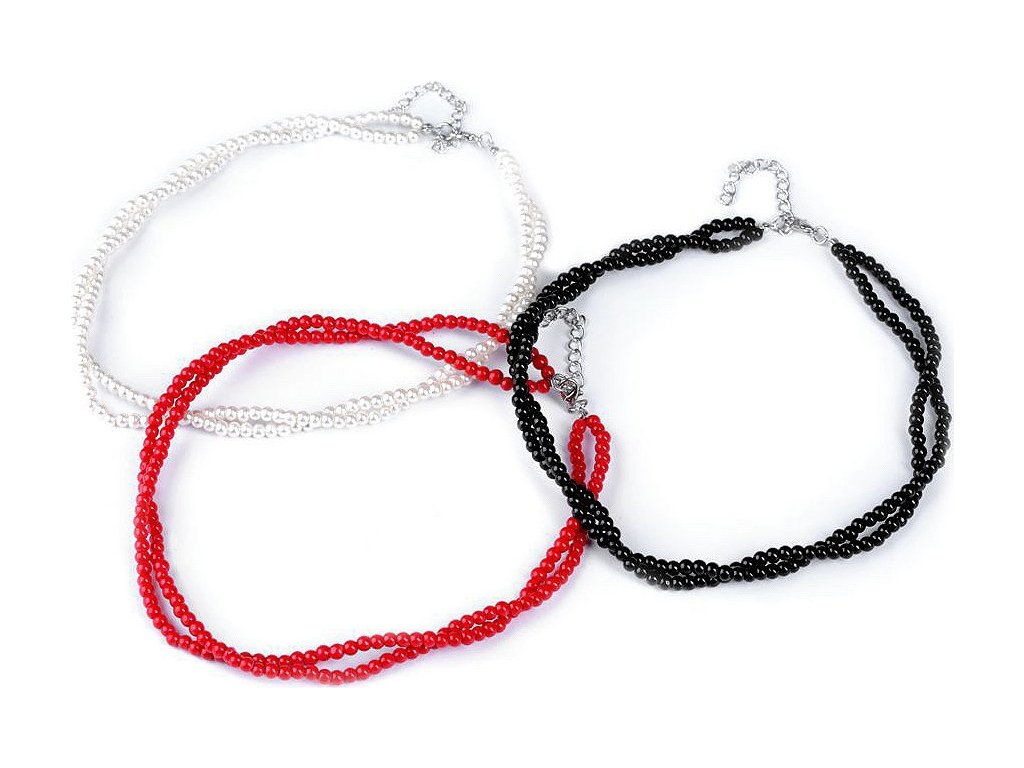 Jemný perlový náhrdelník potěší každou ženu. Je dárkem, se kterým nešlápnete vedle. Náhrdelník je spletený ze dvou pramenů. Perly mají průměr 5 mm. Hodí se ke slavnostním příležitostem, jako jsou plesy, svatby, návštěvy divadel a různé večírky. Voskové perly velice věrně napodobují perly pravé, jedná se o cenově dostupnou variantu. Náhrdelník se zapíná na karabinku a prodlužovací řetízek. Náhrdelník č. 3 a 6, červený a černý, nemá perlový lesk