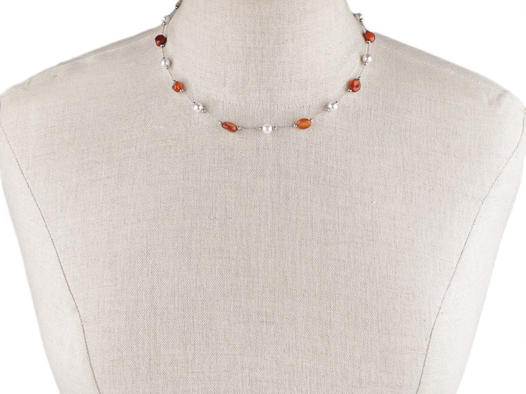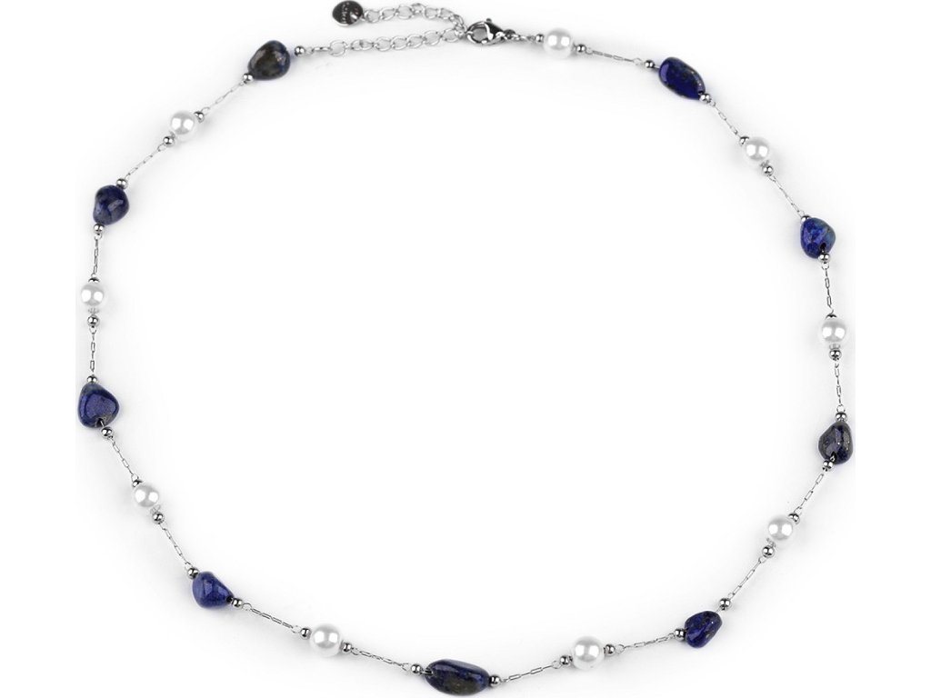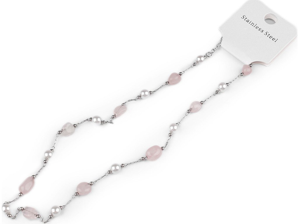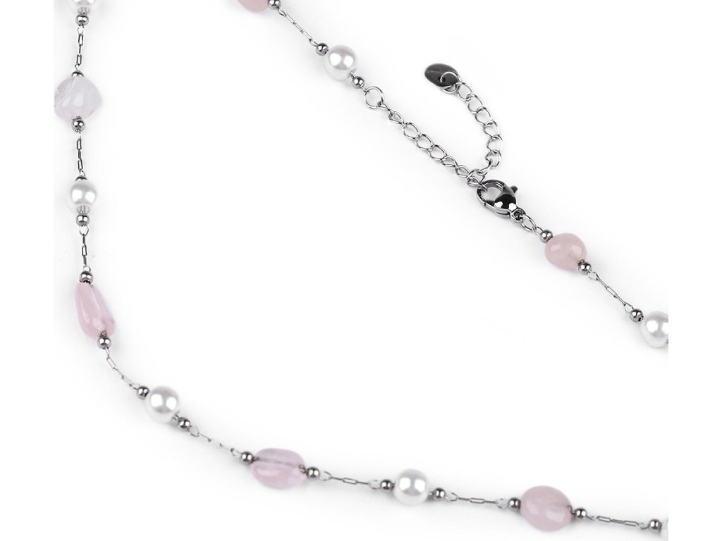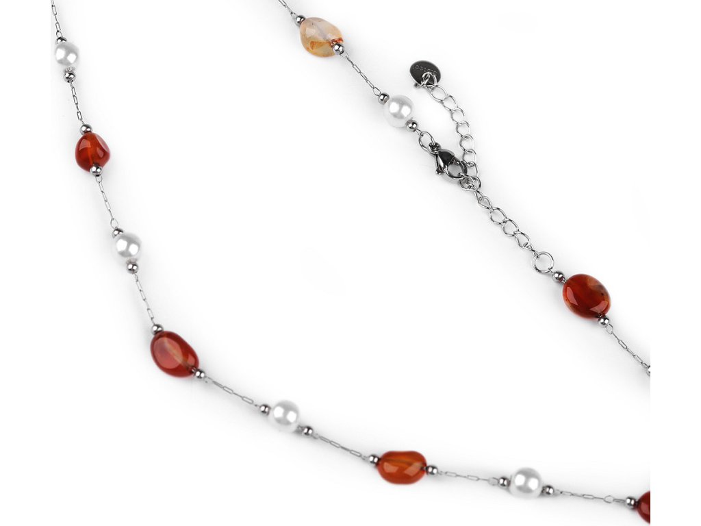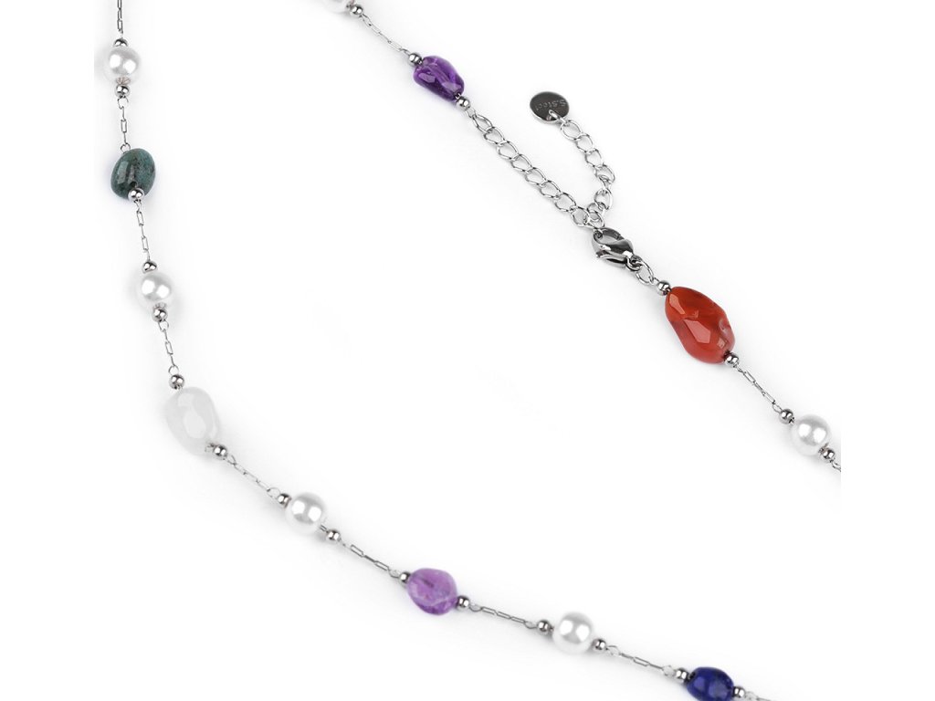 Jemný řetízkový náhrdelník z kvalitní nerezové oceli je ozdobený barevnými korálky syntetických minerálů a perlami. Korálky mají působivé průsvity, jedná se o zdařilou kopii pravých minerálů. Náhrdelník se hodí k slavnostním šatům i na běžné nošení, má velice všestranné využití. Zapíná se na karabinku a prodlužovací řetízek. Upozorňujeme zákazníky, že barvy i tvar korálků se může lišit.
