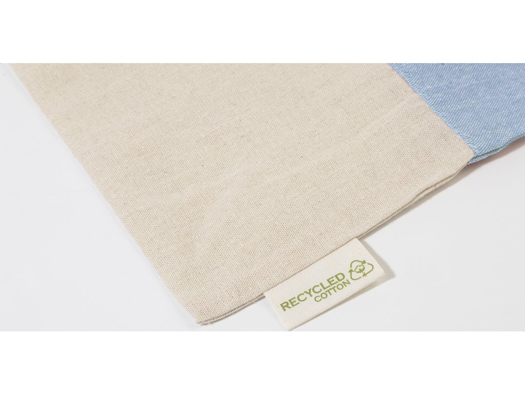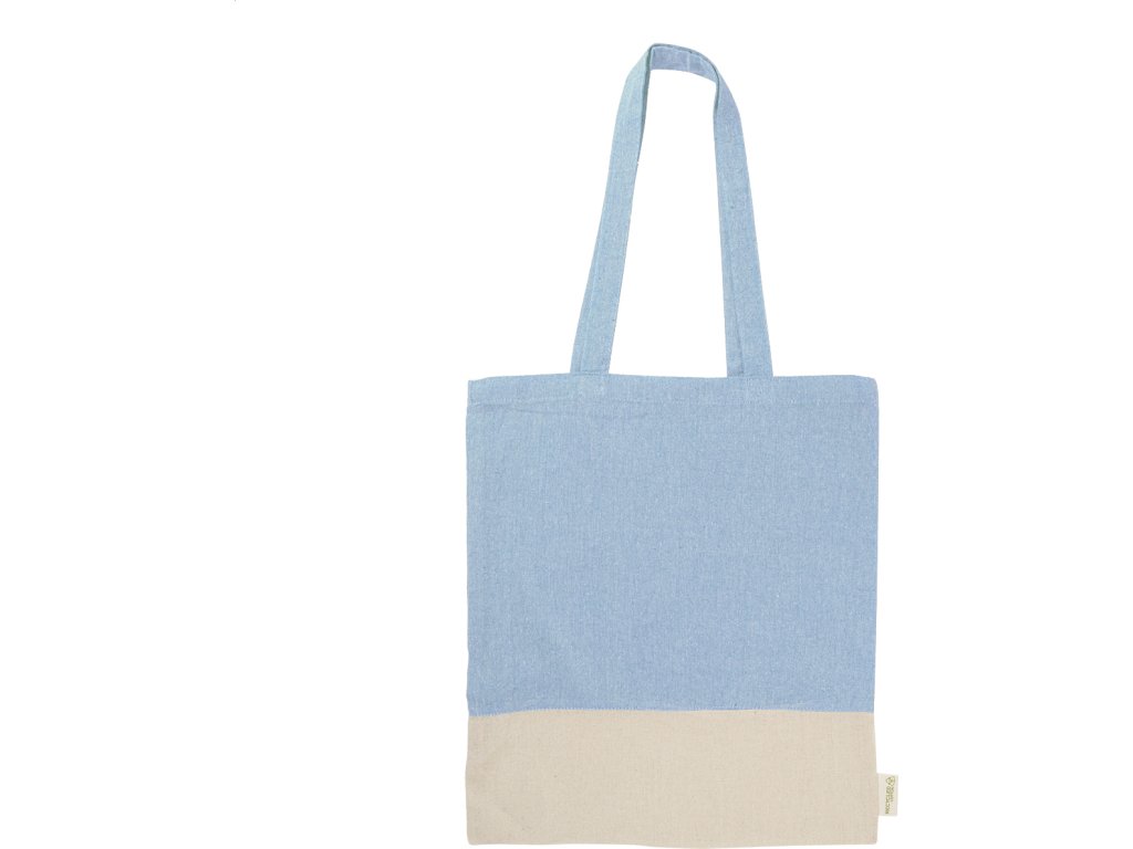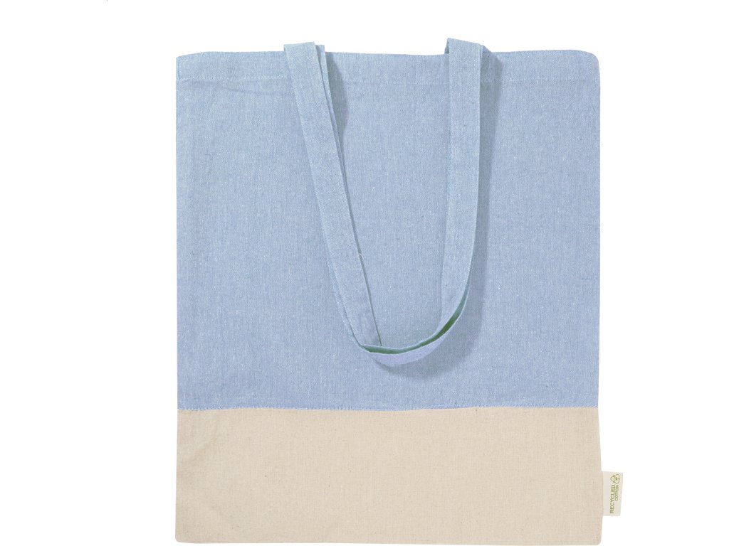 Dvoubarevná nákupní taška z recyklované bavlny s dlouhými uchy a výrazným štítkem z recyklované bavlny. 100% recyklovaná bavlna, 120 g/m².