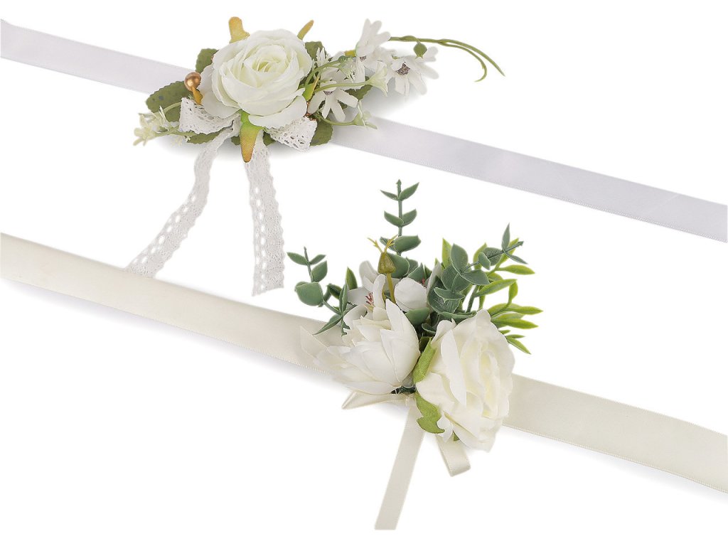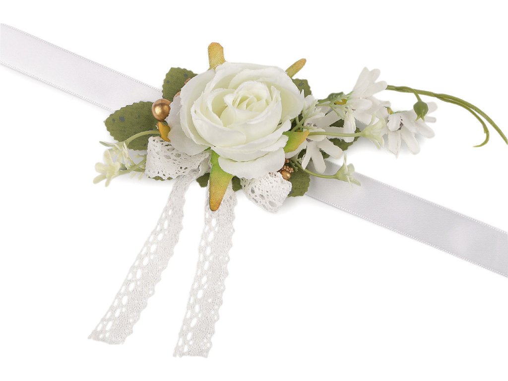Romantický náramek s květy růží je určený především pro svědkyni, družičku, maminku nebo jen tak. Potěší všechny ženy, které se rády zdobí poetickými doplňky. Pomocí saténové stuhy se uváže okolo zápěstí, má univerzální velikost. Květy jsou doplněné zelenými větvičkami a lístky a mašličkou. Náramek je nejen krásným doplňkem, ale také památkou na výjimečné okamžiky. Je perfektní na živo i na fotografiích. Průměr růžiček je cca 5 cm, rozměr celé květinové ozdoby je cca 11 - 15 cm. Stuhy jsou dlouhé cca 40 cm.