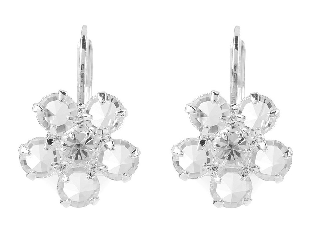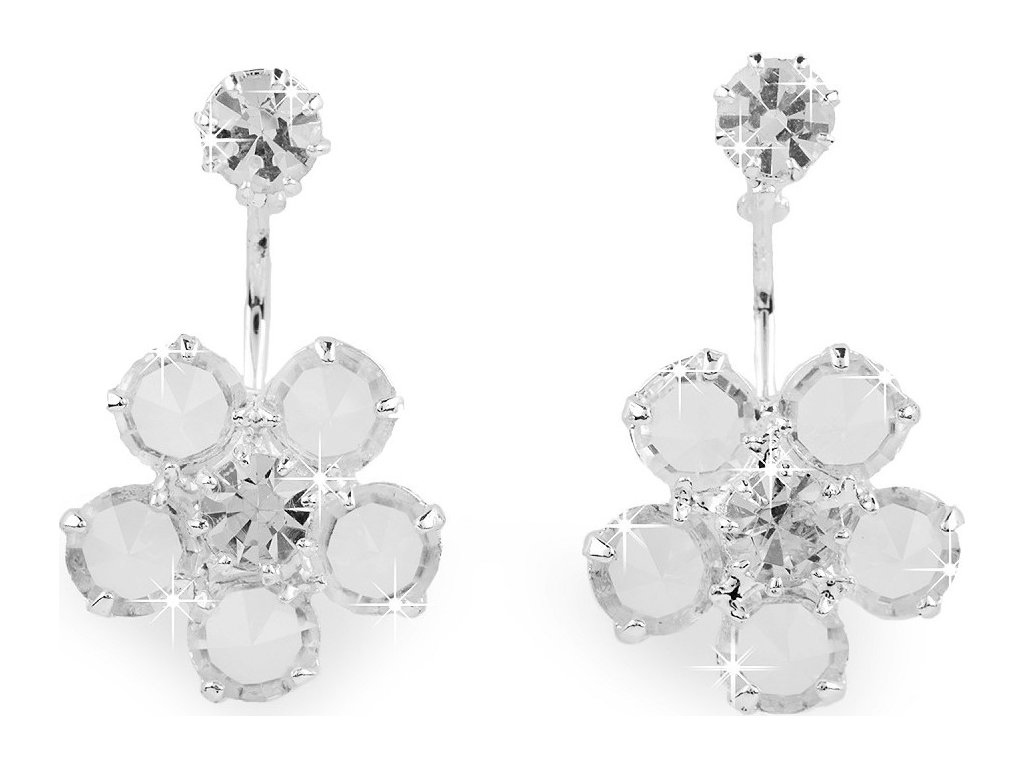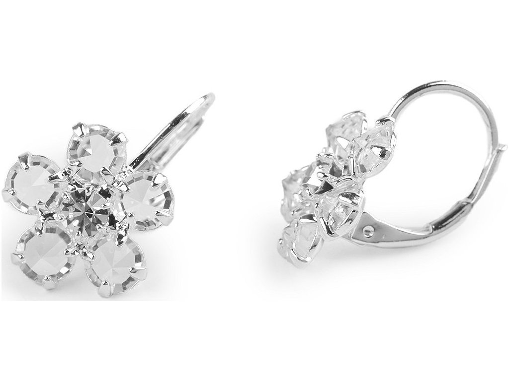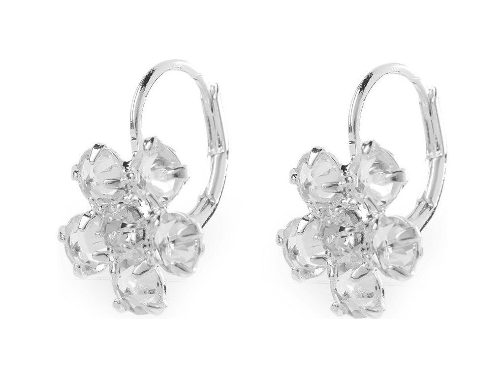 Elegantní náušnice s květem jsou ozdobené broušenými kamínky. Každá žena je ocení na běžné nošení i slavnostní události, jsou nepřehlédnutelné. Skleněné broušené kamínky mají prvotřídní českou kvalitu jsou pevně zasazené do kovového lůžka. Na slunci i umělém světle se náušnice zajímavě třpytí. Kov na náušnicích má povrchovou úpravu se stříbrnou galvanizací. Náušnice mají uzavřené mechanické zapínání.