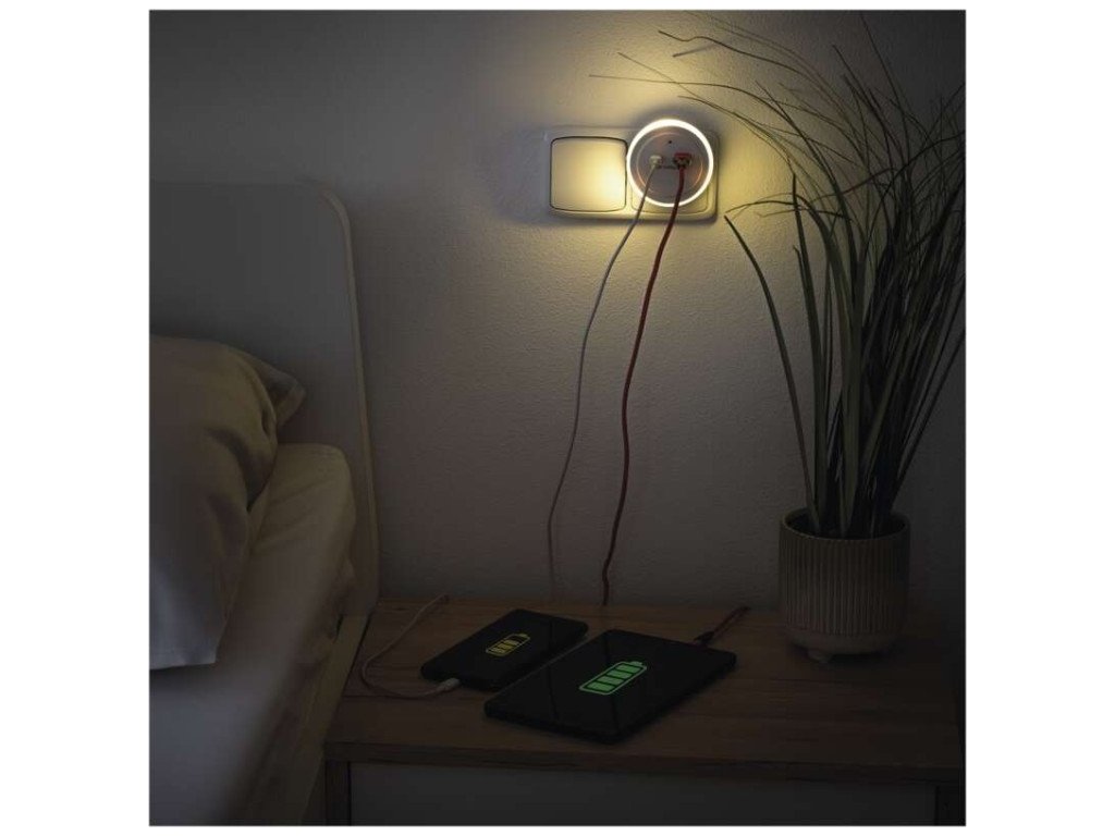 Noční světlo s třemi režimy svícení (ON/OFF/AUTO) a fotosenzorem pro automatické zapnutí/vypnutí. Teplá bílá barva, 5 lm, dosvit 2 m. Dva USB porty s max. výstupem 3,4 A pro snadné nabíjení. Nízký příkon 0,3 W, ochrana proti přetížení, přepětí a zkratu.