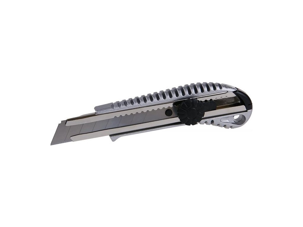 Odlamovací nůž, kovové tělo, protiskluzné drážky, ocelová vodící lišta, šroubková aretace, 18mm.