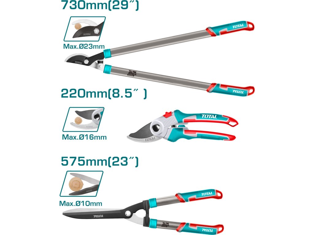 Sada 3 nůžek na větve, která obsahuje: 1 ks nůžek na prořezávání 220 mm/8,5 palce. Kvalitně vybroušená ocel z CrV slitiny umožňuje rychlé stříhání větví a keřů. Díky lehké slitině a pryžovému konci nůžek je práce s nimi zábava. 1 ks nůžek na živý plot 575 mm/23 palce. Nůžky jsou opatřeny 20cm dlouhou čepelí, která je tepelně tvrzena. Možnost polohy rozteče ostří. Opatřeny jsou pryžovou protiskluzovou úpravou úchytu. 1 ks nůžek na větve 730 mm/29 palce. Příjemné kleště s protiskluzovou úpravou rukojeti a bezpečností pojistkou proti rozevření. Tepelně ošetřená čepel Čep s teflonovým nátěrem