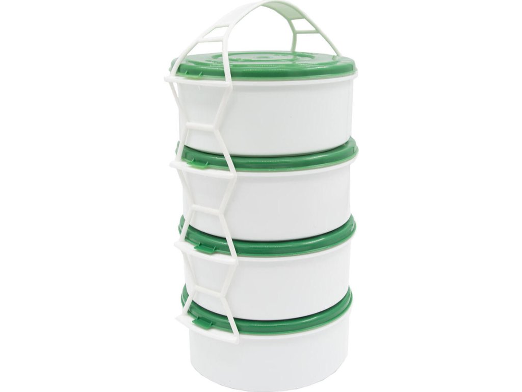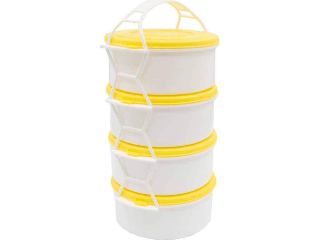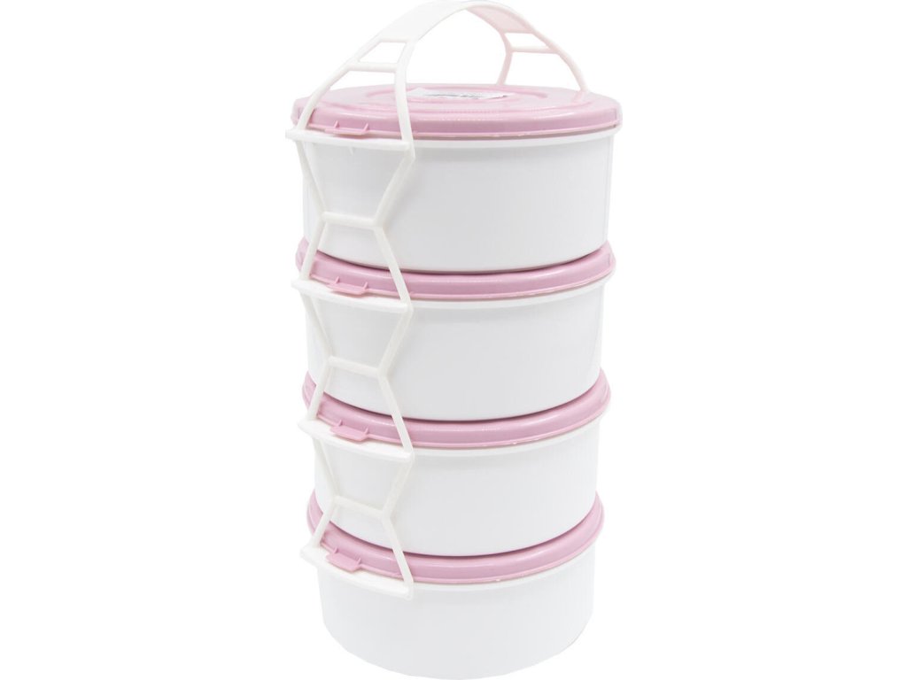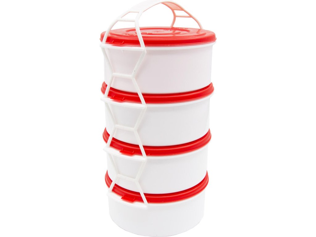 Jídlonosič 4 x 1 l, PH mix barev. 4 díly objem: 4 x 1,0 l materiál: plast bílá miska, barevné víčko mix barev: žlutá, oranžová, růžová, červená, zelená Box na ukládání a přepravu jídla, složený ze 4 dílů, které jsou navzájem propojené držadlem.