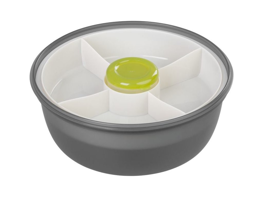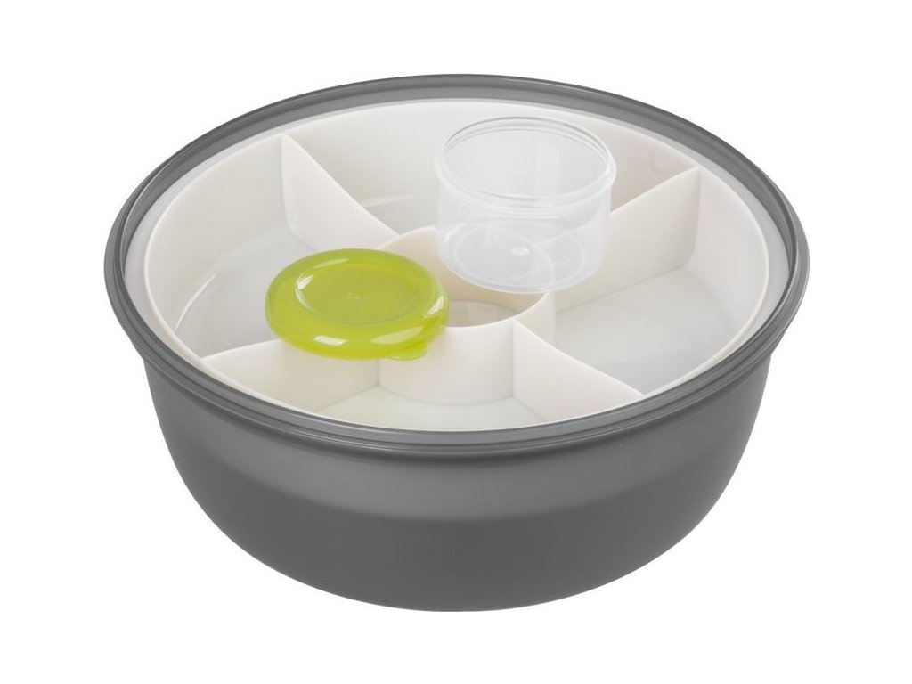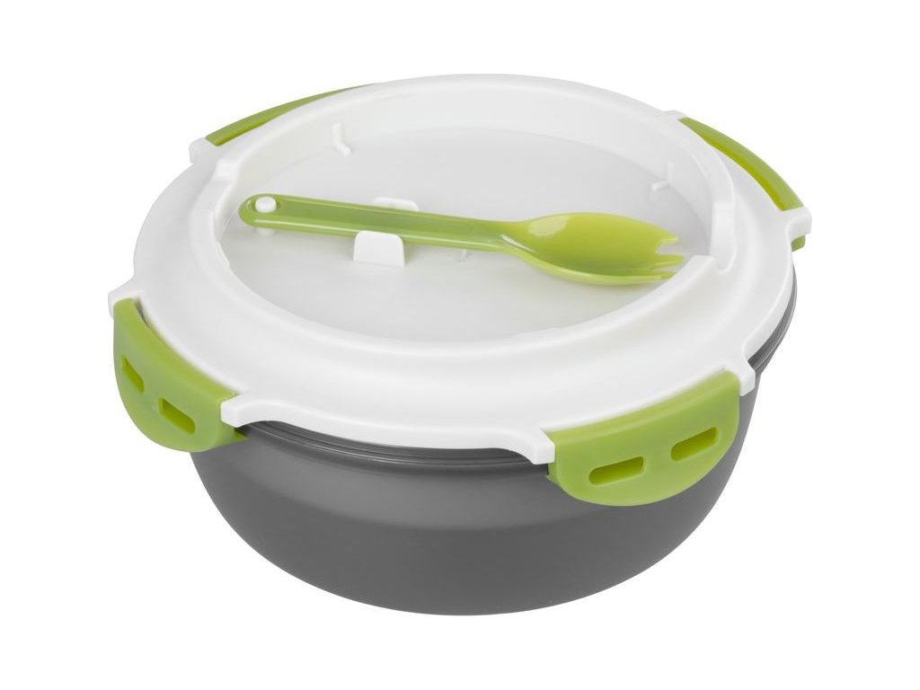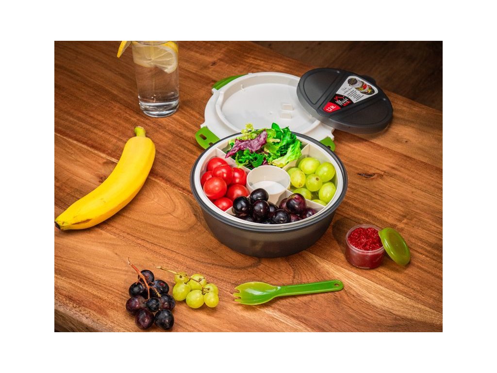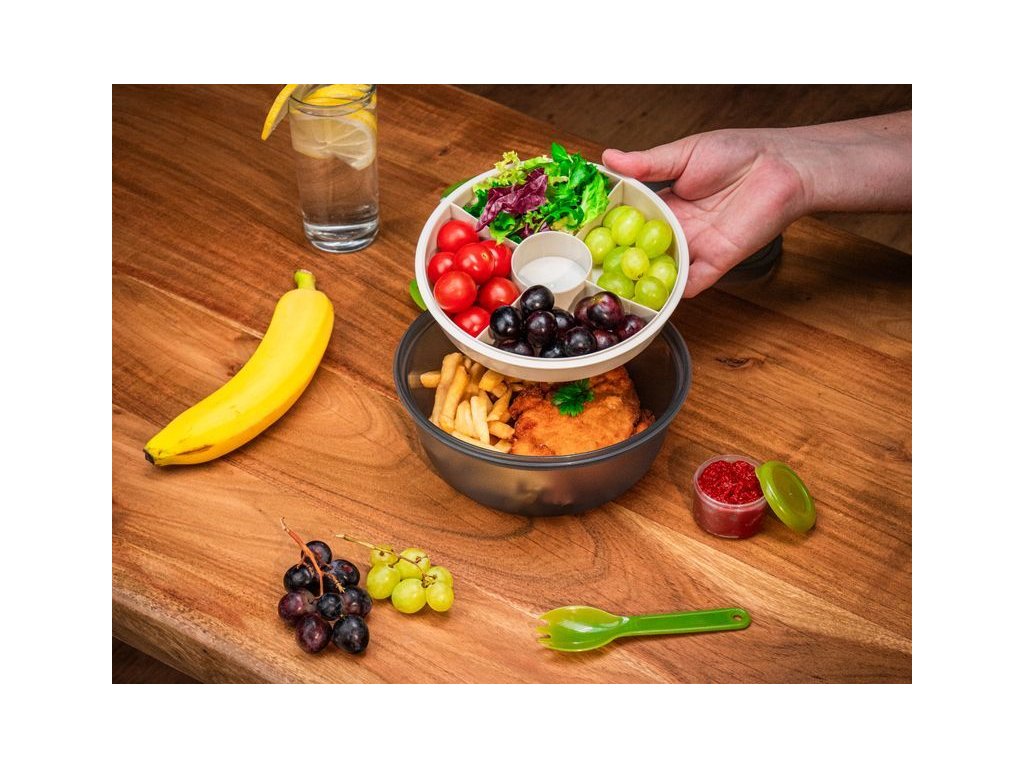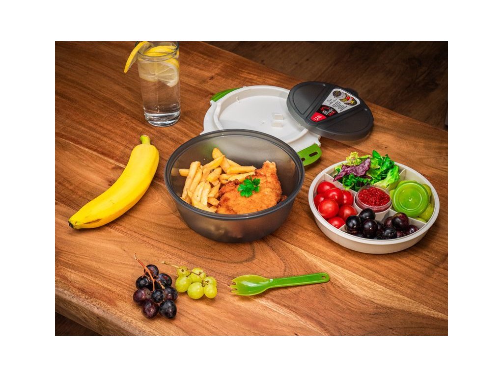 Obsahuje vidličku/lžíci a misku s přihrádkami, jejichž prostřednictvím budete mít rozdělené jednotlivé pokrmy.