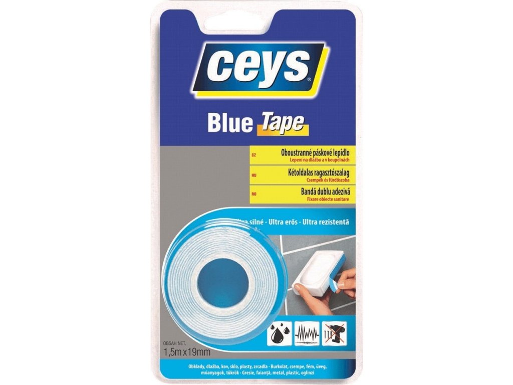 CEYS blue tape páska na obklady a koupelny je oboustranné páskové lepidlo s ultra silným účinkem.