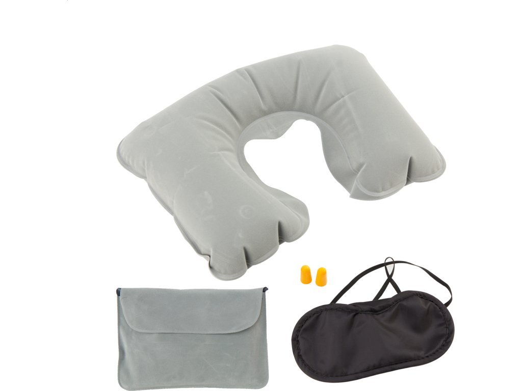 Cestovní set s nafukovacím polštářkem za krk, maskou na oči a špunty do uší. Dodáváno ve stejně barevném sametovém obalu.