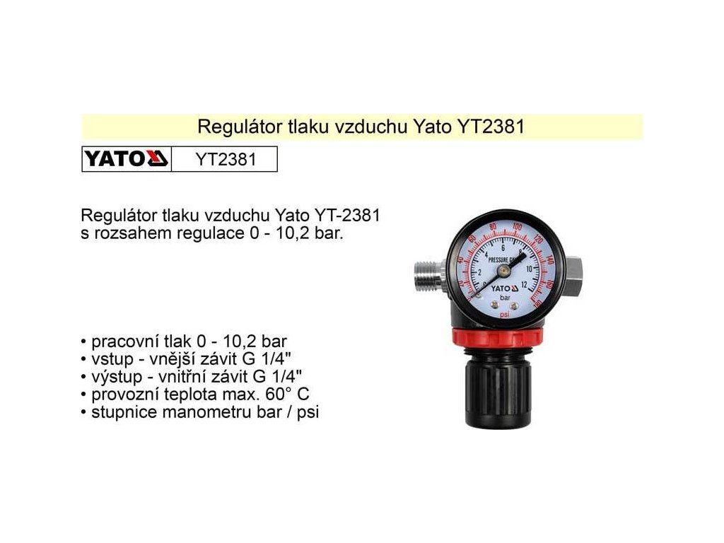 Regulátor tlaku vzduchu Yato YT-2381 s rozsahem regulace 0 - 10,2 bar.