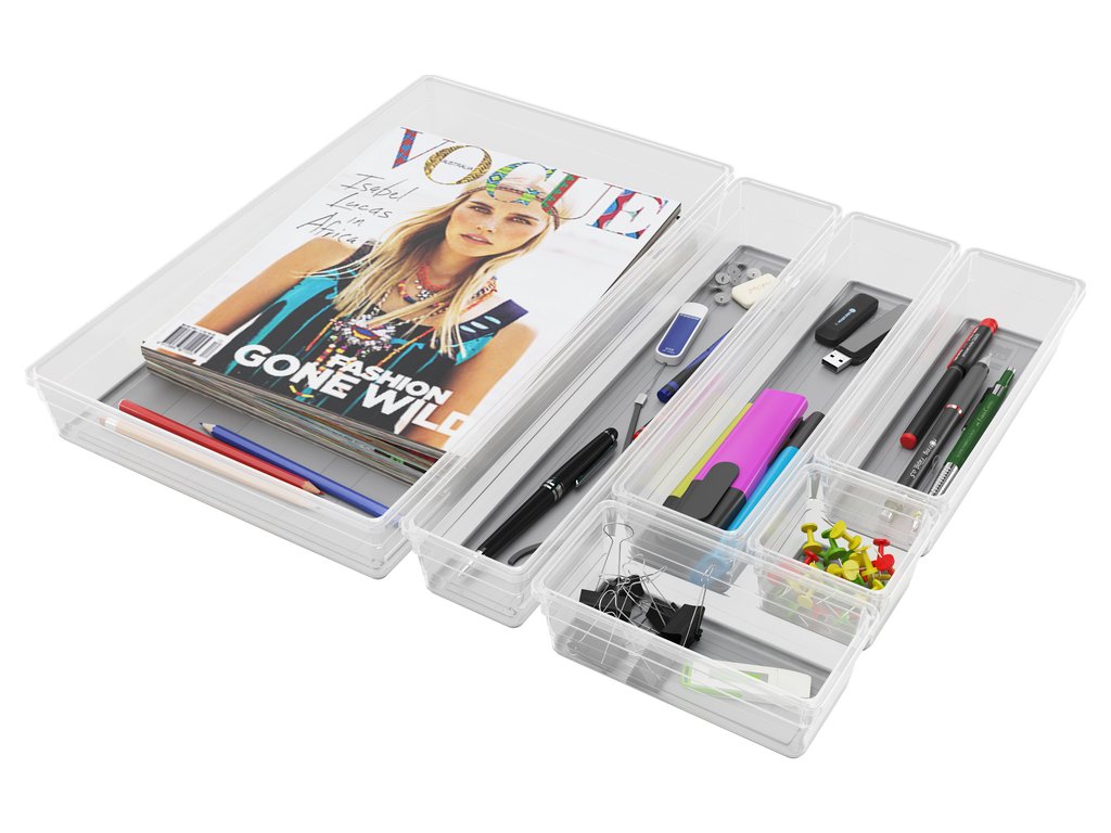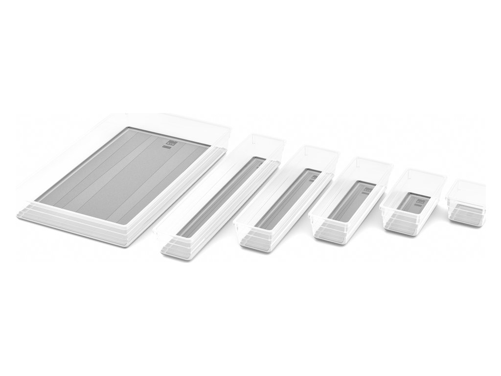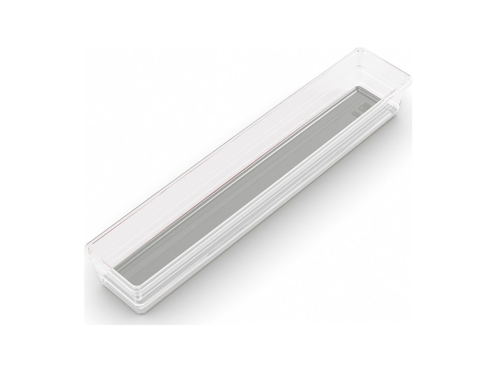 Transparentní plastový organizér, protiskluzová základna, vhodný do kuchyně, kanceláře i koupelny, modulární a stohovatelný. Rozměry 37,5 x 7,5 x 5 cm.