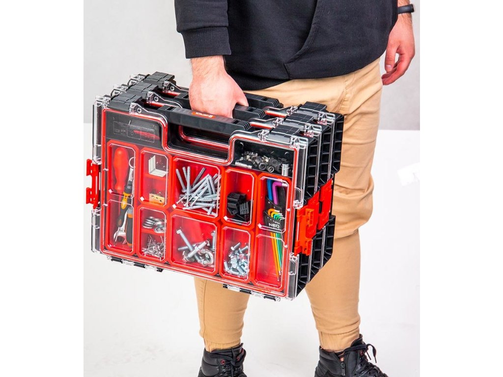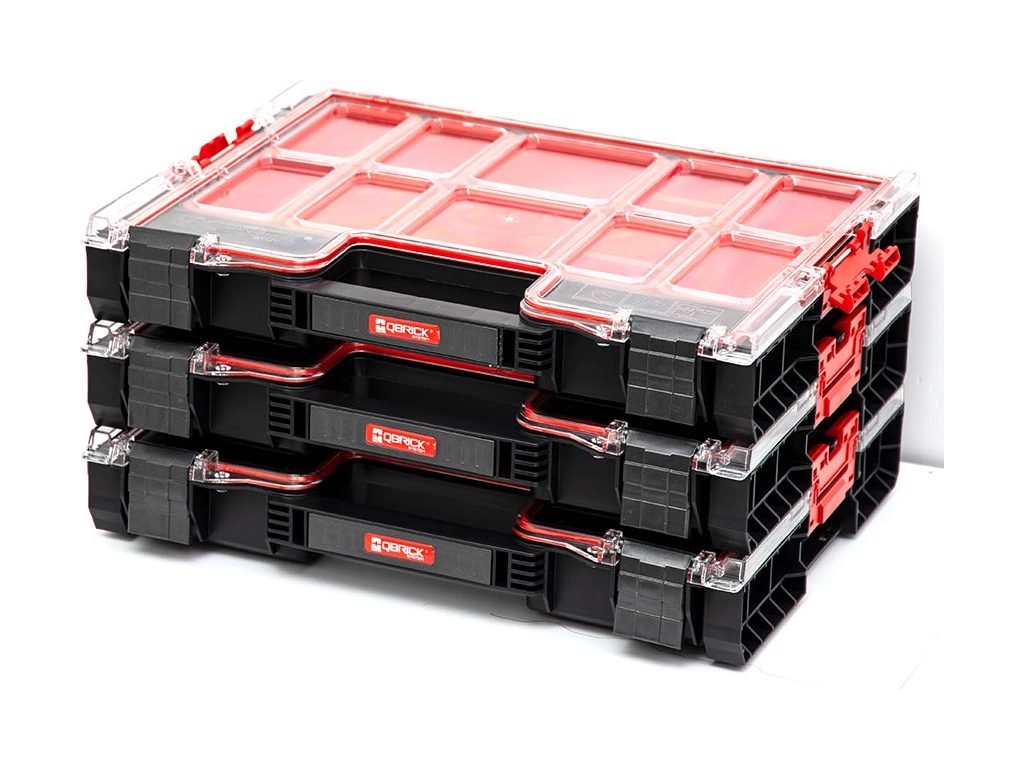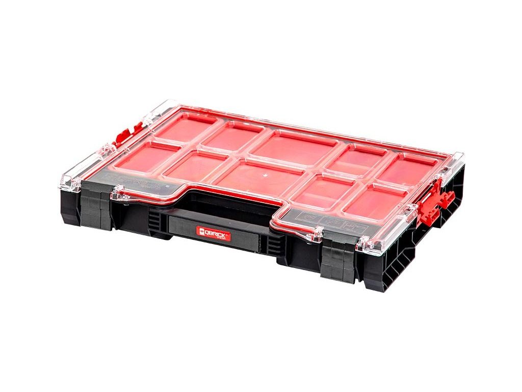 Qbrick System PRO Organizer 200 je stredný model z rady PRO. Okrem štandardnej výbavy tejto rady, ktorá zahŕňa patentovaný Easy Access System, tesnenie vo veku, superodolné veko z polykarbonátu, polyamidové bočné konektory - ponúka veľmi pohodlnú rukoväť, polyamidové predné zapínanie a dve ďalšie priehradky. Organizér obsahuje 8 hlbokých priehradiek v rôznych veľkostiach.