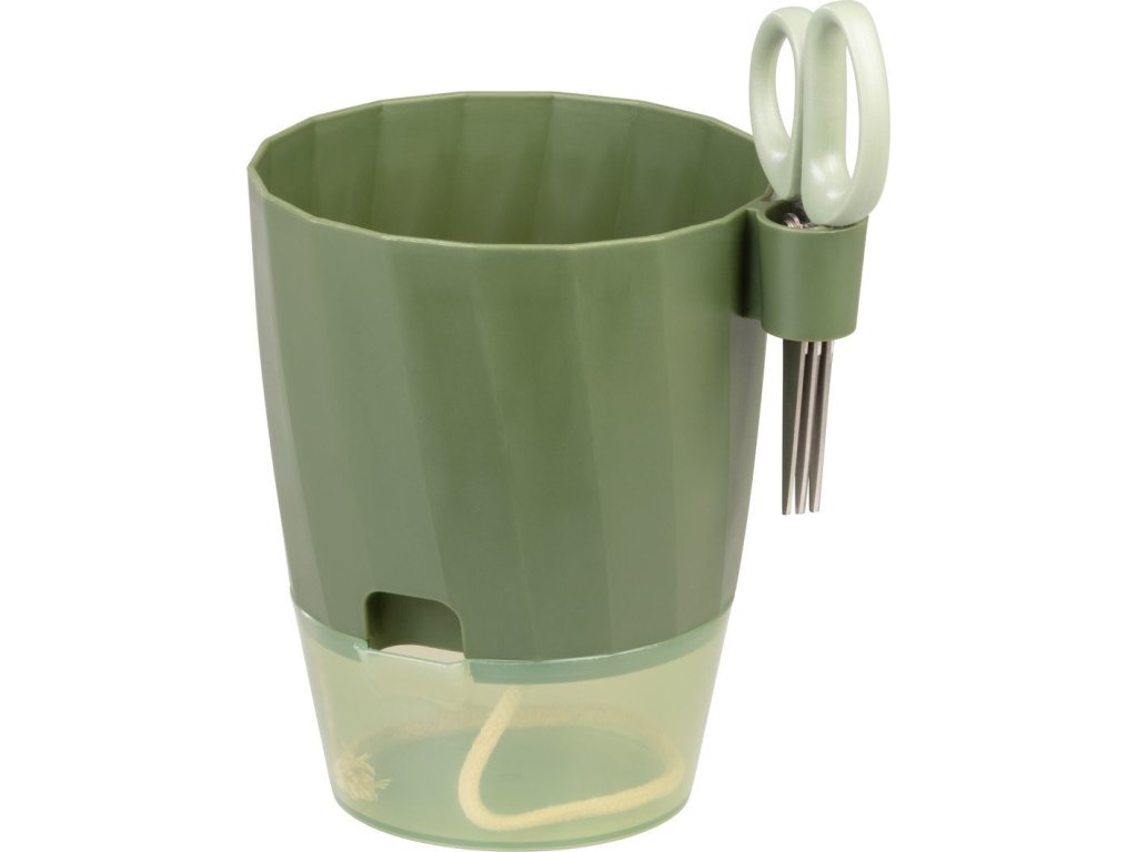 Květináč Strend Pro se zahradnickými nůžkami v zelené barvě je praktickým řešením pro každého pěstitele bylinek a menších rostlin. Díky kompaktním rozměrům 15,5×12,5×16 cm je ideální na okenní parapety, kuchyňské linky či balkony.