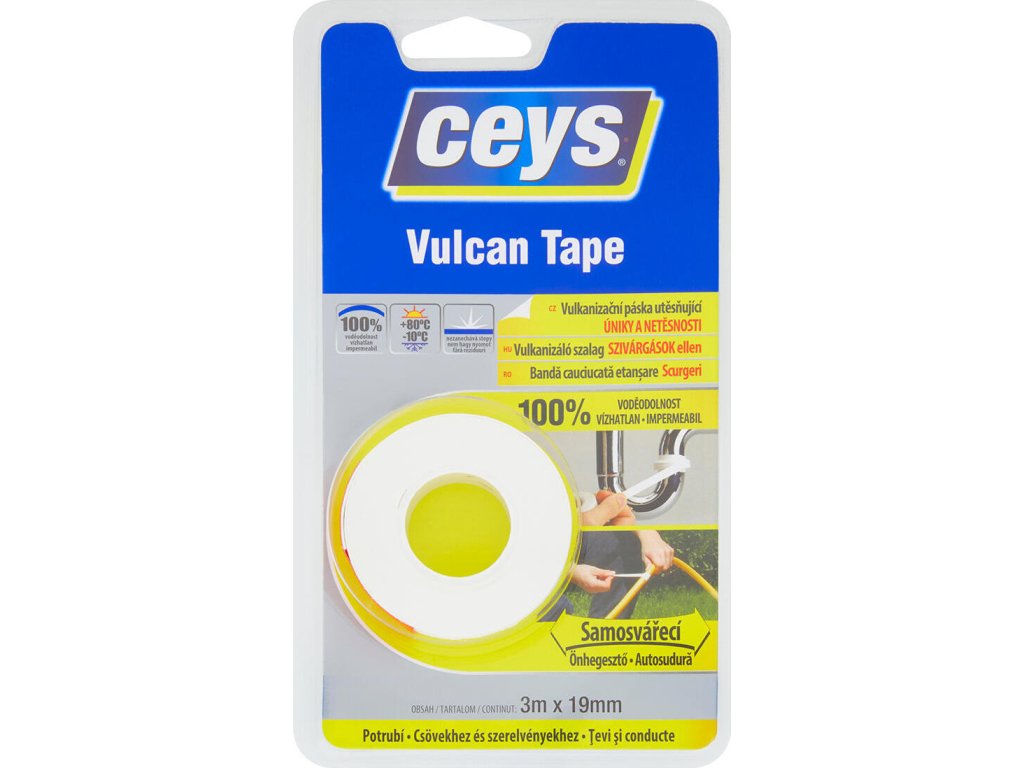 Vulcan Tape utěsňující páska okamžitě vyřeší netěsnosti u jakéhokoli typu potrubí nebo vedení, praskliny nebo poškozené závity i pod tlakem nebo s korozivními kapalinami (kromě benzinu, motorové nafty nebo minerálního oleje).