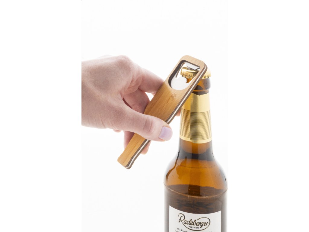Otvírák na lahve z nerezové oceli ve tvaru lahve s bambusovým povrchem.