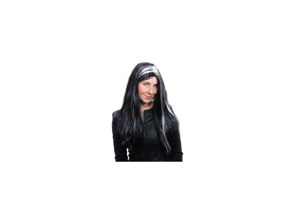 Karnevalová paruka v motivu čarodějnice. Paruká má dlouhé černé vlasy a je dekorována stříbrným melírem.