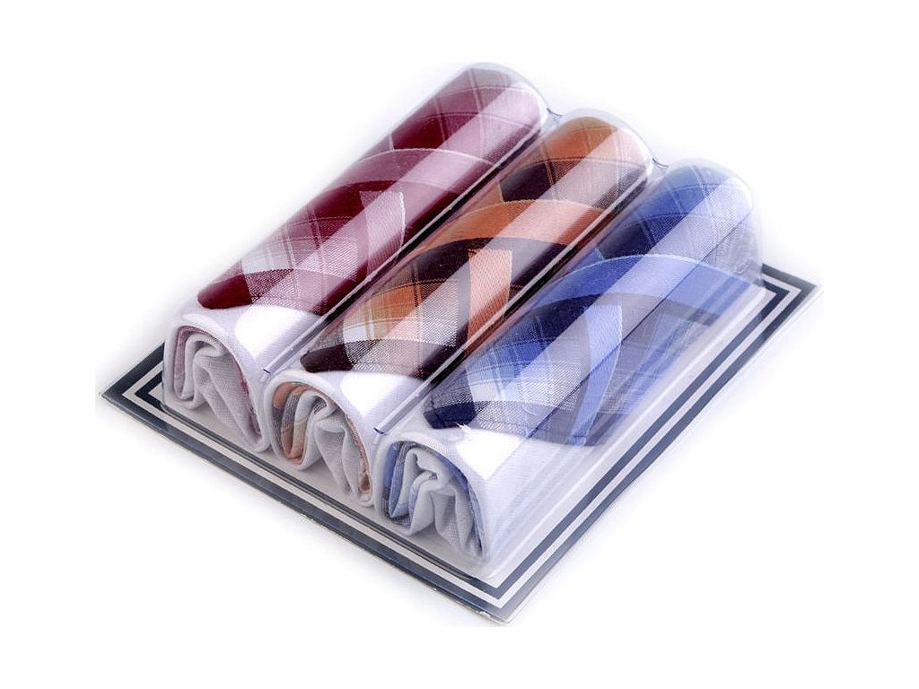 Pánské kapesníky různých dezénů a barev mají rozměry 43 x 44 cm. Jsou baleny v plastové krabičce po 3 kusech. Nabízíme vám sady v náhodném mixu, jelikož v zásobách dostáváme sady s rozdílnými dezény.Mix náhodných variant obsahuje druhy kapesníků, které máme právě skladem. Skladba kapesníků u jednotlivých variant se může mírně lišit.