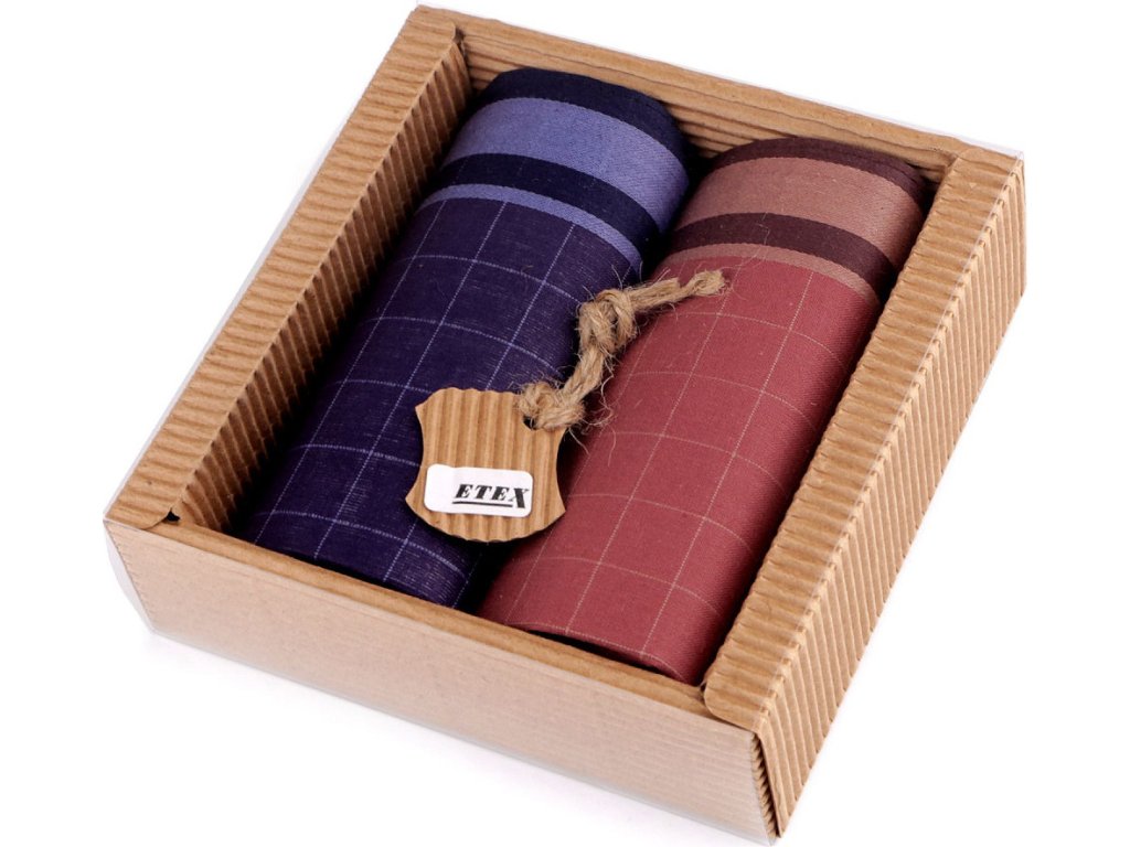 Luxusní sada pánských kapesníků je vhodná pro všechny muže. Kvalitní bavlněné kapesníky mají klasické dezény proužků a kára. Kapesníky jsou zabalené v dárkové krabičce z vlnité lepenky přírodního vzhledu s transparentním víkem. Mohou vám posloužit jako hodnotný dárek. V krabičce najdete 2 čtvercové kapesníky. Varianta "mix" obsahuje druhy kapesníků, které máme právě skladem.Skladba kapesníků u jednotlivých variant se může mírně lišit.